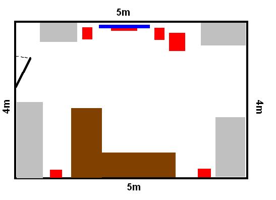 I dźwięk jest... hmm przyzwoity, ale to jednak nie to czego oczekuję. Wymiary pokoju widać na obrazku, czerwone to kolumny, brązowe - miejsce oglądania/ słuchania, niebieskie telewizor, szare to meble. Czytałem o kalibracji mikrofonem pomiarowym (który jest w zestawie), ale nie wiem czy to pomoże(?). Problem w tym , że bas na przeciw telewizora na kanapie jest ... powalający, za to metr dalej przy meblach prawie go nie ma...pomyślałem: może fazy? więc szybki przycisk (w subbasie jest odwracanie fazy o 180st.), i jeszcze gorzej... W czym więc problem? Dodam że materiały(muzyka) są wysokiej jakości- źródło to MD sony, DVD, kable jak już wspomniałem optyczne.