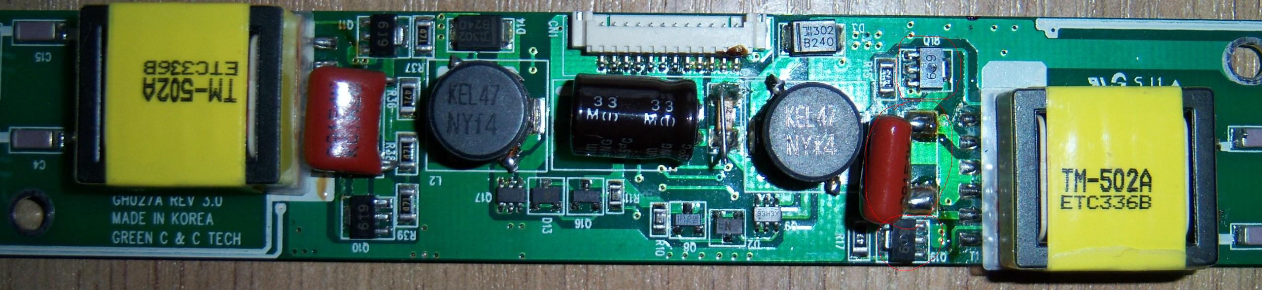 Witam przed sylwestrem. Padł inwerter w w/w monitorku, a właściwie dwa tranzystory i kondensator w końcówce (zaznaczone na rysunku na czerwono). Inwerter GH027A REV 3.0 Green C & C TEch. Czy ktoś wie jakie tam siedzą tranzystory mocy smd, oznaczone jako 619. Pomocy