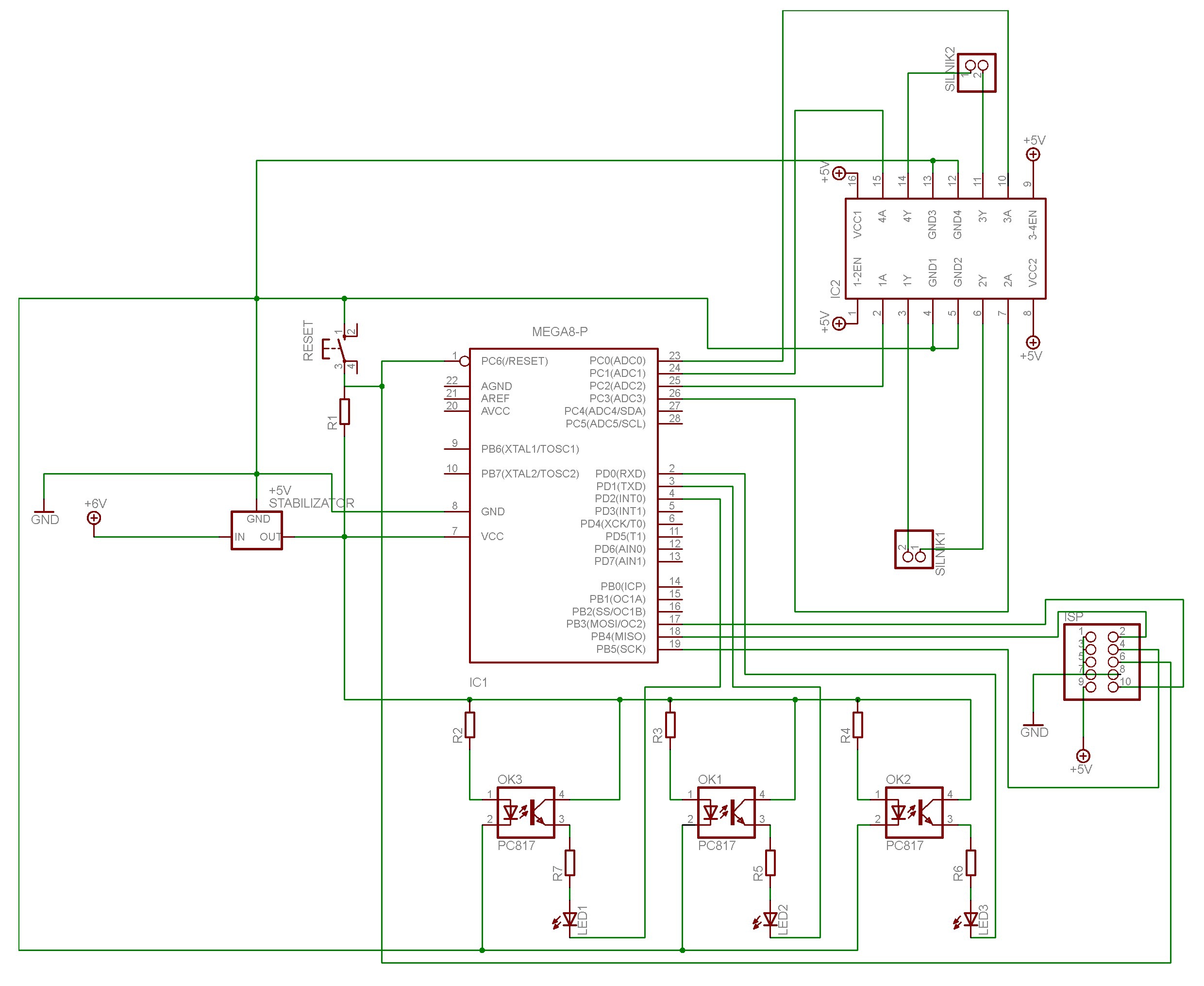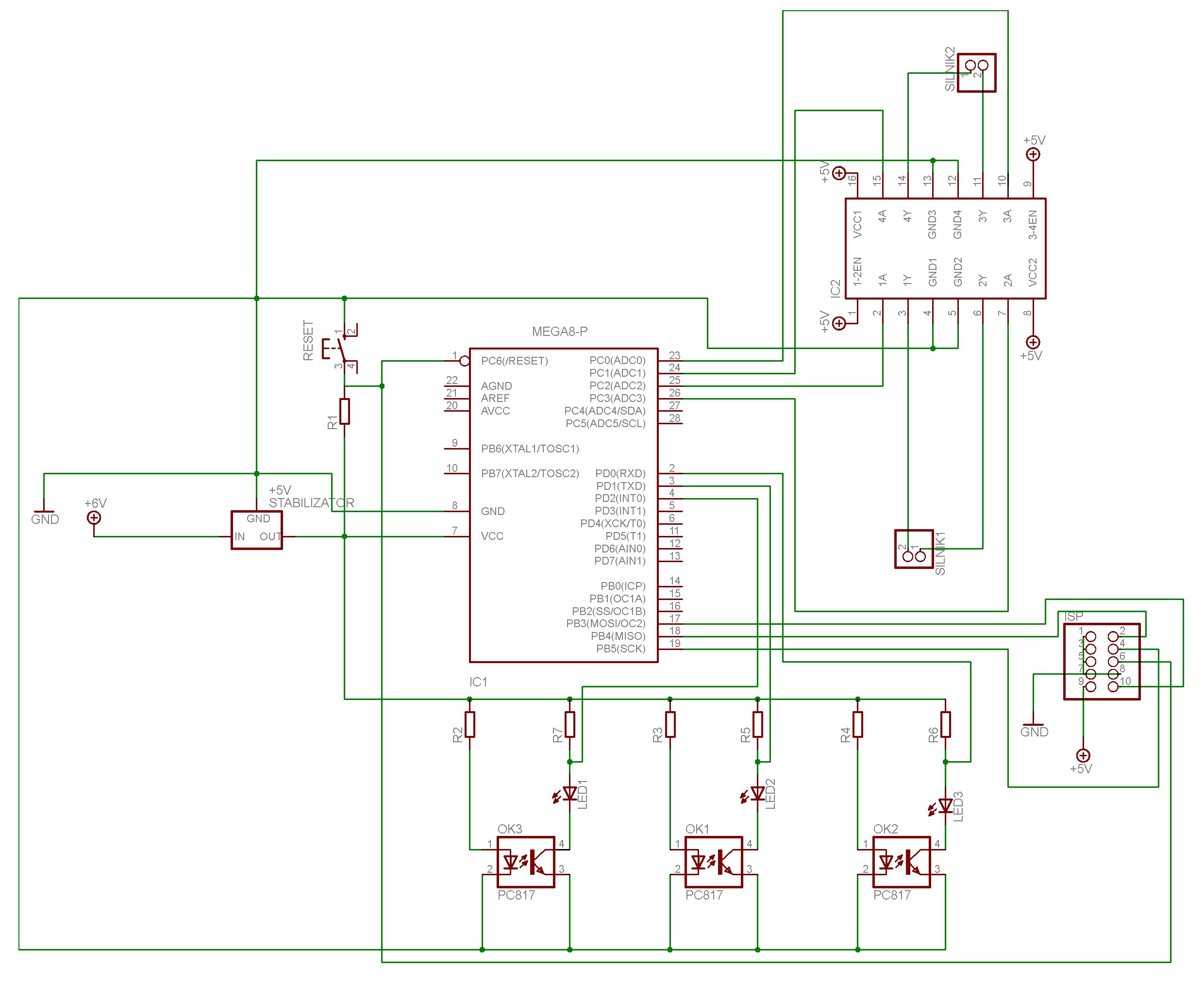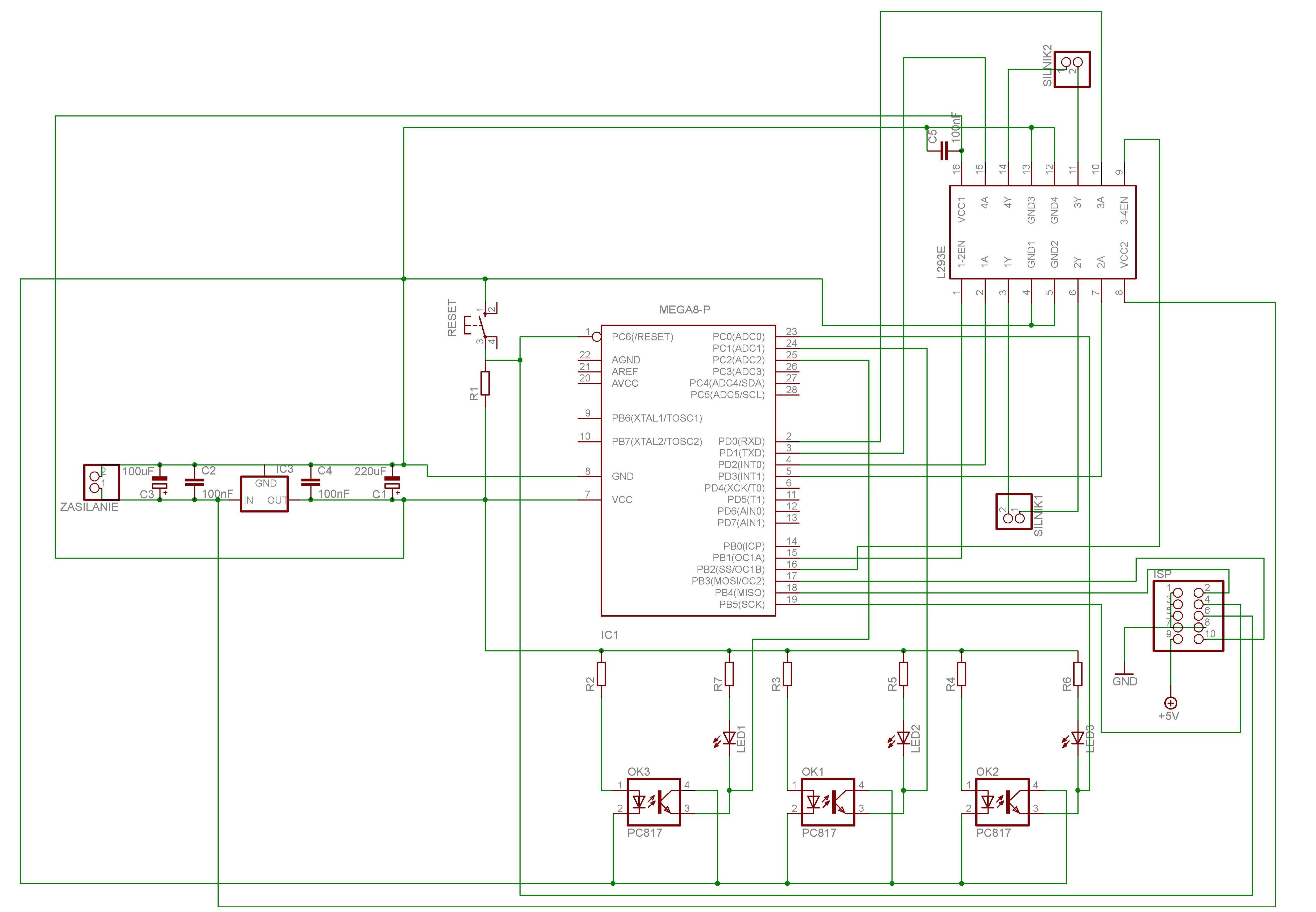 Korzystając z wolnego czasu postanowiłem zrobić robota jeżdżącego za czarną linią, mechanikę już mam, 2 silniki prądu stałego. Sterowanie silnikami ma się odbywać na zasadzie prawo, lewo (nie chcę korzystać z PWM). Programowanie robota nie powinno być dla mnie problemem, gorzej z elektroniką... Mógłby ktoś prześledzić schemat i powiedzieć czy zadziała ? I poradzić gdzie ewentualnie brakuje kondensatora, rezystora, bądź jakiegoś dławika (przy silniku bodajże powinny być, ale nie wiem jak je dobrać i jak połączyć). Dodam, że zasilanie będzie z 4 baterii AAA 1,2V, przez stabilizator. Czujniki odbiciowe CNY70. A te diody przy czujnikach mają wskazywać który aktualnie przewodzi napięcie. I przy tych czujnikach właśnie nie wiem czy wszystko jest ok.