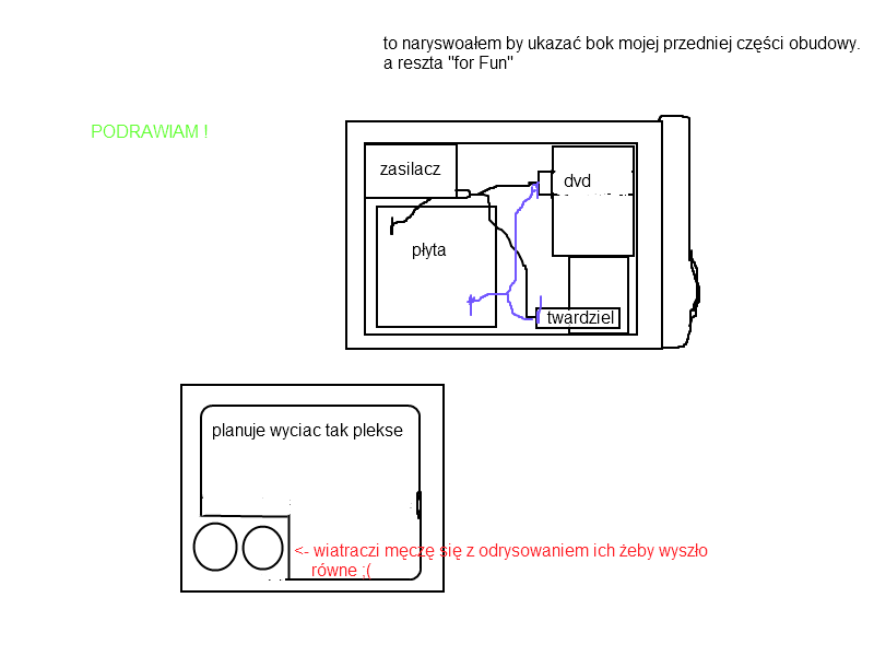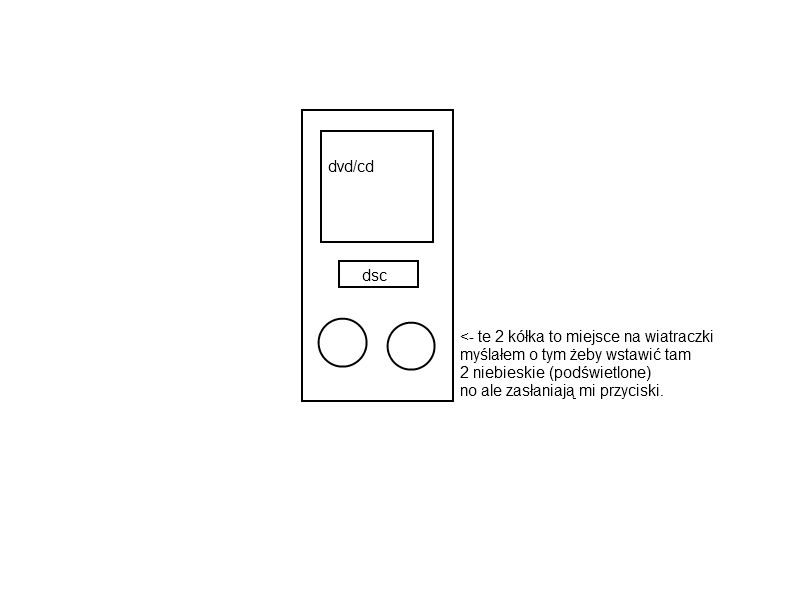 Dokładnie chciałem prosić o radę co mogę zrobić z moim panelem myślałem o wstawieniu tam jakiegoś ekraniku ale nie wiem jak to zamontować.Też chciałem wyciąć dziurę w przednim panelu ponieważ za nimi są 2 otwory na wiatraczki ale w tym problem że po wycięciu nie mam zielonego pojęcia jak i gdzie wstawić przyciski power i res,wydaje mi się że w miejsce po stacji dys. lub stacji dvd/cd o to mój obrazek przedstawiający przednią część obudowy bez panelu: