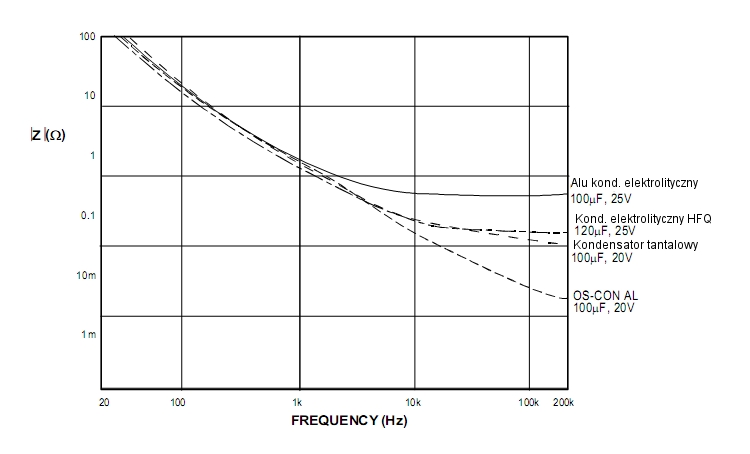 Kondensatory są prawdopodobnie najważniejszym elementem filtrującym w przypadku zasilaczy impulsowych. W przypadku filtrowania w zakresie od 10 kHz do 100 MHz można wyróżnić trzy zasadnicze typy kondensatorów: elektrolityczne, z tworzyw sztucznych i ceramiczne. Kondensatory elektrolityczne to elementy najczęściej stosowane ze względu na dużą rozpiętość pojemności od ułamków do tysięcy uF. Mogą one również pracować w szerokim zakresie napięć, od kilku do około 500 V. Aluminiowe kondensatory elektrolityczne mogą pracować jako elementy filtrujące do częstotliwości około 100 kHz. Kondensatory z tworzyw sztucznych (np. poliestrowe, polipropylenowe) posiadają wyższą częstotliwość graniczną – 10 MHz. Jednak przy dużych wartościach pojemności i napięcia znamionowego, mają dość duże wymiary obudów. Najwyższą częstotliwością graniczną wyróżniają się kondensatory ceramiczne. Niestety i one nie są wolne od ograniczeń. Górny zakres pojemności wynosi dla nich 0,1 uF, a napięcia to 200 V. Przy wielkich częstotliwościach istotnymi parametrami są ESR i ESL. Pierwszy z nich to ekwiwalentna szeregowa rezystancja. Najwyższy ESR posiadają aluminiowe kondensatory elektrolityczne. W pewnych przypadkach większa rezystancja szeregowa pozwala uzyskać lepsze tłumienie rezonansów o wyższych częstotliwościach. ESL to parametr opisujący ekwiwalentną szeregową indukcyjność. Im wyższy ESL dla wielkich częstotliwości, tym mniejsza skuteczność tłumienia. Na powyższym obrazku zamieszczono wykres zależności między modułem impedancji, a częstotliwością dla różnych rodzajów kondensatorów. Największe różnice odnotowujemy powyżej 3 kHz. Aluminiowy kondensator elektrolityczny posiada najwyższy moduł impedancji głównie ze względu na wyższy parametr ESL dla wyższych częstotliwości. Kondensator elektrolityczny przeznaczony do zasilaczy impulsowych zachowuje się podobnie do kondensatora tantalowego (dopiero powyżej 30 kHz kondensator tantalowy ma mniejszą impedancję). Najmniejszym modułem impedancji wyróżnia się kondensator OS-CON. Jest to specjalna wersja kondensatora elektrolitycznego, w którym rolę elektrolitu pełni organiczny półprzewodnik. Kondensatory te ze względu na niskie ESR i ESL zachowują dobre własności tłumienia dla wielkich częstotliwości.