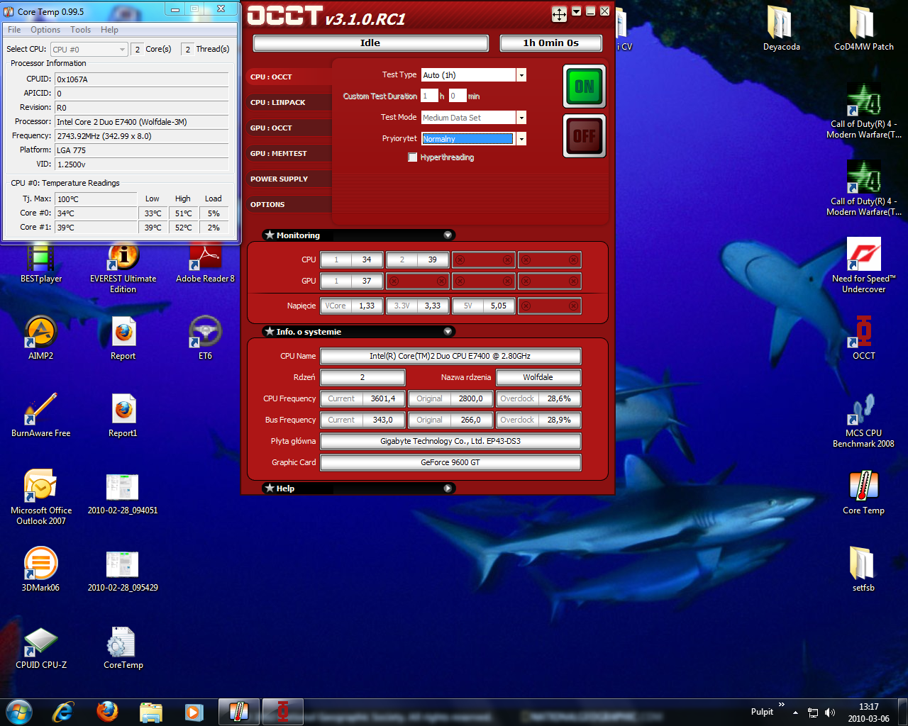 Witam. Żeby nie zakładać dwóch tematów napisze 2 w 1. Posiadam procesor core2duo e7400 który ma zegar standardowo 2,8 ghz. udało mi się go podkręcić go jak na razie na boxowym chłodzeniu żeby stabilnie pracował do 3.3 ghz, później to się wiesza jak tylko zacznę grać. Domyślam się że to wina zasilacza, bo jak tylko zmienię ustawienia karty graficznej ze standardowym na wyższe (które przed kręceniem procka chodziły stabilnie) to monitor mi wariuje, wyłącza się i blue screen. Chciałem się dowiedzieć ile można z niego wykręcić na maxa na boxowym chłodzeniu ? bo nie wiem czy inwestować w zasilacz czy zostawiać tak jak jest, jeżeli róznica będzie 200-300 mhz tylko.