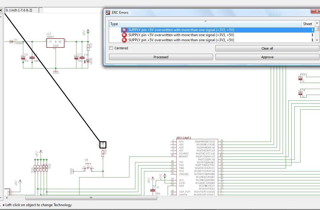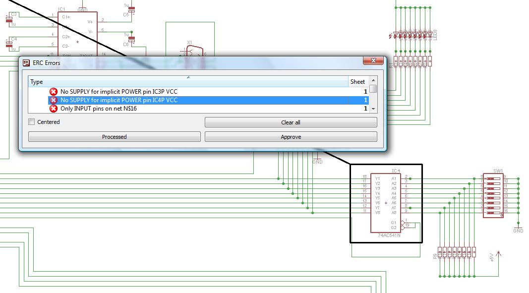 W pierwszym przypadku "złap" układ scalony i przesuń go po skosie a zobaczysz na czym polega błąd. W drugim, to niewłaściwie zastosowany element biblioteczny, na dodatek łączący dwa różne potencjały. W trzecim, to brak połączenia układu scalonego do szyn zasilania (inne oznaczenia). A panel "board" - o czym pisze kolega "marco47" aby był kompatybilny ze schematem, musi być otwarty , tylko w przypadku, gdy był już stworzony i zapisany. a schemat jest modyfikowany.