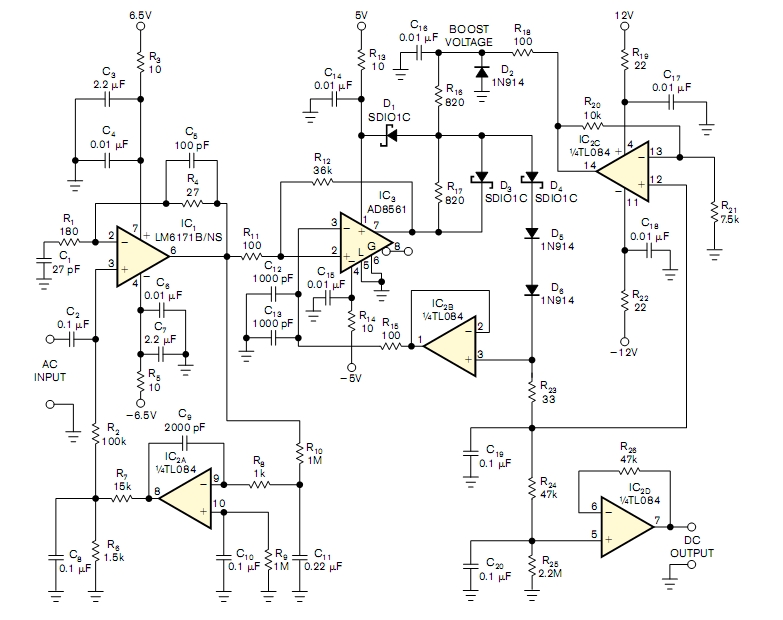 Układ przedstawiony powyżej pracuje w zakresie od 100 Hz do ponad 14 MHz przy amplitudzie sygnału wejściowego od 100 mVp-p do 6 Vp-p. Dla wielkich częstotliwości maksymalny użyteczny poziom sygnału wejściowego maleje. Impedancja wejściowa wynosi 100 kΩ, a pojemność wejściowa 3 pF, zatem układ ten może współpracować z różnymi urządzeniami. Pojemność wejściowa powoduje spadek impedancji wejściowej do poziomu 3,5 kΩ dla częstotliwości 15 MHz. Na wejściu znajduje się wtórnik, który przekazuje napięcie do komparatora IC3. Układ IC2a i elementy mu towarzyszące monitorują poziom napięcia stałego na nóżce 6 IC1 i minimalizują napięcie stałe pojawiające się na wejściu nieodwracającym bufora wejściowego. Aby zminimalizować błędy detekcji wartości szczytowych, wejściowy sygnał powinien być symetryczny względem zera. Wyjście komparatora IC3 zmienia na stan wysoki, jeśli napięcie na nóżce 2 jest większe niż na nóżce 3. Następnie do tej wartości napięcia ładowany jest kondensator C19. Rezystory R24 i R25 oraz kondensator C20 stanowią filtr i tłumik ograniczający napięcie wyjściowe, gdyż jest ono wyższe niż wartość szczytowa obecna na nóżce 3 IC1. Układ IC2c i elementy towarzyszące podtrzymują stan naładowania kondensatora C19. Dioda D1 przeciwdziała wzrostowi napięcia na wyjściu ponad wartość napięcia zasilania.