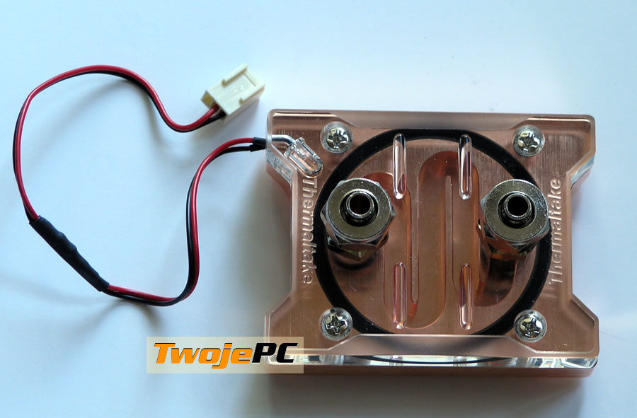 Za dokładnie 54zł dorwałem z allegro używany zestaw Thermaltake BigWater. Mam więc chłodnicę małą, aluminiową, na jeden wentylator 12x12cm, pompkę Big Water 400l/h ze zintegrowanym rezerwuarem, węże 3/8" (fi wewn. 6.4mm), złączki, przepływomierz, no i nieco drętwy blok Thermaltake niestety bez mocowań.