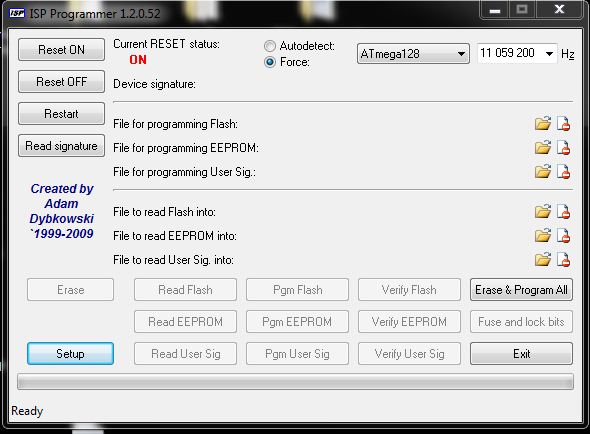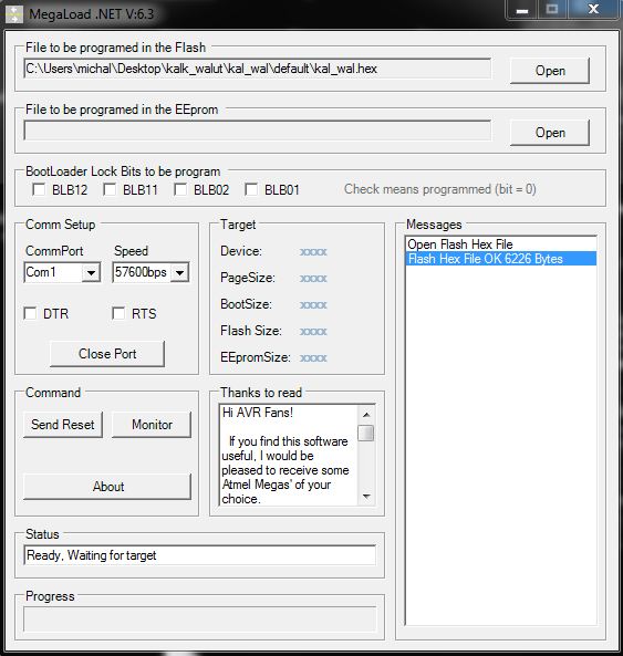 Witam, posiadam układ ATMEGA 128, jest to cały zestaw uruchomieniowy, programowany jest po uart. Chce wgrac flash przez Megaload, jednak po podłączeniu wybraniu pliku .hex i resecie nic sie nie dzieje. Co może być tego przyczyną? Megaload ściągnąłem ze strony microsyl.com.