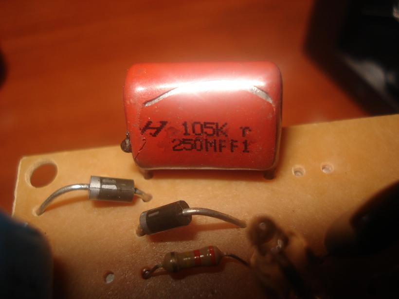 Stroboskop podłączyłem do prądu, pochodził 5min i nagle dym, smród i błysk co 4sekundy. Rozkręciłem go i po oględzinach zauważyłem przepalony kondensator