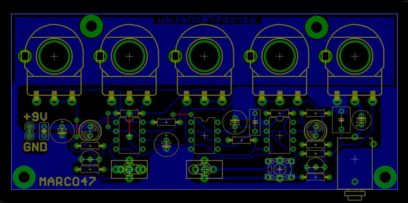 Link . Ja przerysowałem dokładnie tak samo ten schemat w Eagle jak na tym zdjęciu. Z tym, że będą dwie diody, na filmiku gość ma tylko jedną bo pisało, że zrezygnował z tamtej. Chce zrobić prawie taką samą jak on, potencjometrów jeszcze nie kupiłem ale reszta kondensatorów, rezystorów mam i pomierzyłem je i poustawiałem w schemacie średnice wszystkich. Więc proszę nie zmieniać średnic elementów. Mam wszystkie i ten 9014B tranzystor. Czyli na obudowie będą przełączniki, włącznik, przycisk, potencjometry, 2 diody i 6.3 jack. Wszystko połącze kabelkami na obudowie. Generalnie zostaje zaprojektowanie płytki. podaruje punkty, i będę naprawdę wdzięczny.