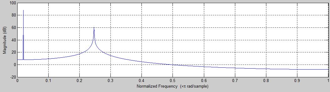 Gdy zmienię częstotliwość 2 sinusoidy na 123.1 Hz otrzymam takie widmo: