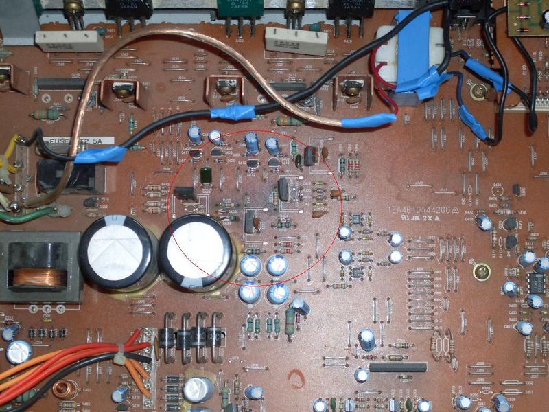 Nie widzę żeby jakiś element był "osmolony" tylko płytka w okolicach kondensatora i tranzystorów (czy to ma jakiś związek z zniekształceniami na jednym z kanałów?)