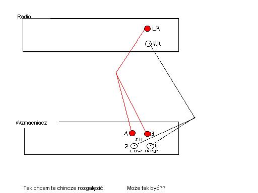 Mam jakąś tubę (taką o: http://www.allegro.pl/show_item.php?item=29017514 ) i wzmacniacz Jet Sound JS6095 (czy coś takiego - jest na nim napisane Hardcore 2x400 W i ładnie wygląda) i teraz nie wiem jak to podłączyć. Wzmacniacz ma 4 x wejście chincz (low input) i kostkę (hi input) oraz zasilanie, do tego wyjście na 4 głośniki i inne przełączniki typu X-Over czy Mode (2 CH - 3 CH - 4 CH). Radio mam Kenwood do którego są podłączone (nie przezemnie bo były już jak auto kupiłem) głośniki (z przodu 2 zwykłe + gwizdki; a z tyłu 2 zwykłe w drzwiach + na półce jakieś Alphardy 160 W mają ładne niebieski membrany bez tego sreberka na środku). Na radiu są jeszcze wyjścia chincz (wolne) i do nich chcem podłączyć ten wzmacniacz. Myślałem żeby dać rozgałęzienie z jednego chincza w radiu na dwa we wzmacniaczu ale nie wiem czy to będzie chodziło (myślę że powinno) i wtedy te alphardy z półki podłączyć do wzmacniacza + podłączyć do wzmacniacza tubę. Jak wtedy poustawiać wzmacniacz. Myslałem że dam na mode 3 CH a X-Over poustawiam tak żeby te alphardy dostawały całe pasmo a tuba tylko niskie (basowe)8 zakresy. Podpowiedzcie jak to popodłanczać bo ja się w tym gubię. I jeszcze jedno: do REMOTE we wzmacniaczy podłanczam sterowanie anteną (daje 11 V jak radio jest włączone) a wzmacniacz nie działa ale jak zrobię mostek z +12V na REMOTE to chodzi. Chciałbym aby wzmacniacz działał tylko wtedy jak radio się włącza ale nie wiem skąd sterowanie wziąść (z radia wychodzą następujący kabelki: czarny - zasialanie, czerwony - nie wiem co to, zółty - chyba masa, niebieski - ten co 11 V daje). Może ten czerwony daje coś ale nie mogę znaleźć jego końcówki.
