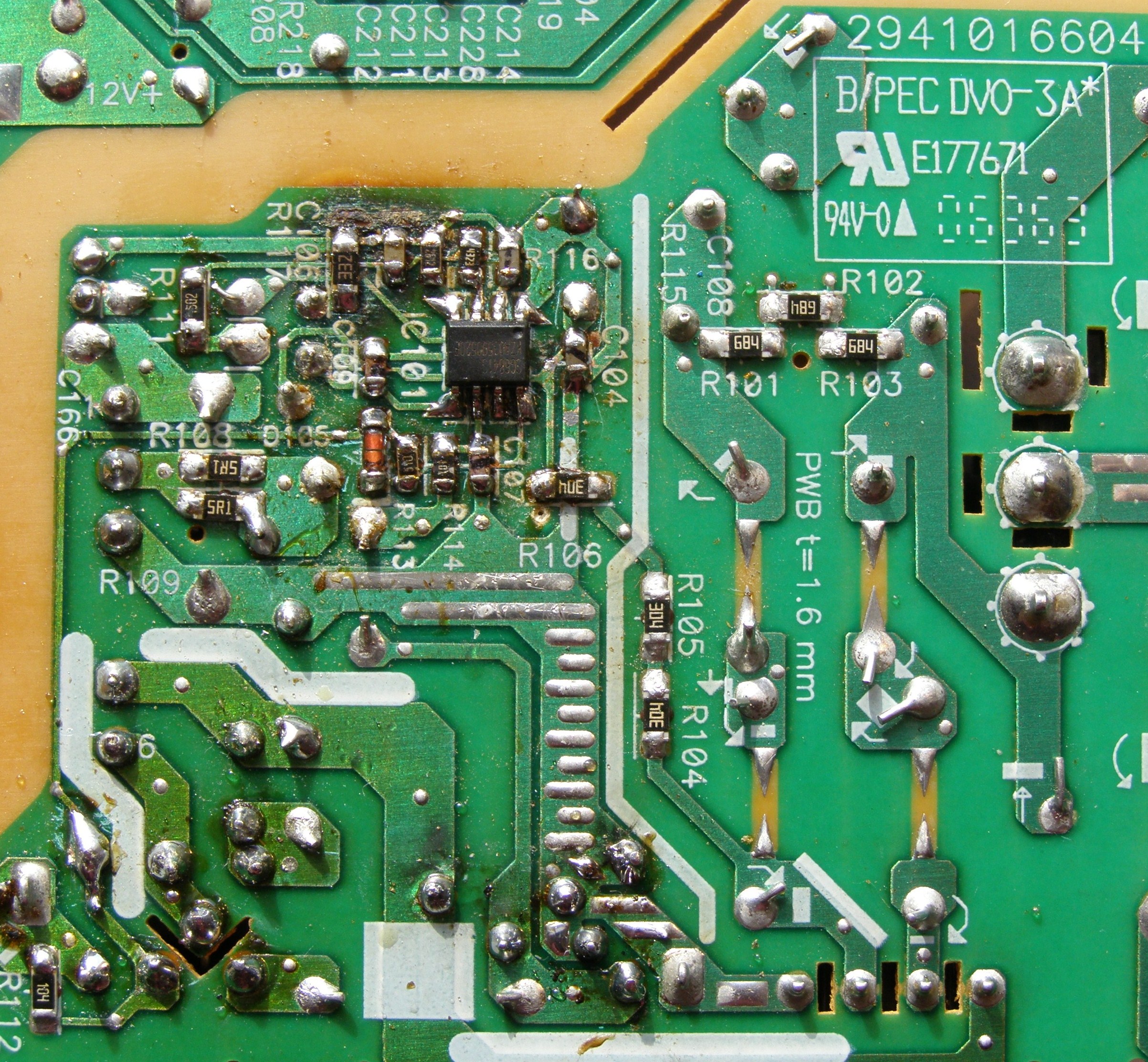 Uszkodzone były: dioda zenera ZD101 na 24V i ZD102 na 5,1V, reszta wizualnie była ok, ale po wymianie tych elementów nic się nie zmieniło - dalej martwa. Poszedłem więc dalej, wymieniłem tranzystor Q101 2SK3562, układ IC101 DAP02ALSZ na SG6841S (podobno zamiennik), posprawdzałem resztę elementów i po włączeniu bez zmian - martwy. Napięcie jest tylko na kondensatorku C101 100µ/400V i dalej nic. Może ktoś podpowie gdzie może być usterka, bo brak mi pomysłów. Czyżby wadliwy IC101?