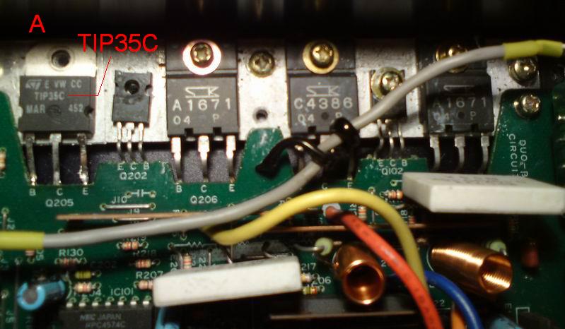 Zostałem niedawno posiadaczem wzmacniacza jak w temacie. Po rozkręceniu obudowy okazało się że był on już naprawiany (wymieniony 1 tranzystor mocy i 4 inne). Ponieważ w temacie napraw wzmacniaczy jestem laikiem i nie wiem kto wcześniej naprawiał ten wzmacniacz, to chciałbym zasięgnąć porady czy naprawa ta została wykonana poprawnie? Chodzi mi głównie o zamienniki, czy są one dobrze dobrane? Na zdjęciach starałem się pokazać co i na jakie elementy zostało wymienione. Dodam, że po podłączeniu wzmacniacza na parę minut działał on sprawnie, zarówno na dwa kanały, jak i po zmostkowaniu. Chciałbym go używać głównie w mostku, do zasilenia tuby, ale obawiam się że jeśli jego naprawa nie została wykonana w należyty sposób może on ulec np. przegrzaniu, albo jego praca będzie niestabilna. Poniżej zamieszczam zdjęcie całego wzmacniacza, na którym zaznaczyłem literką A wymieniony tranzystor mocy, natomiast literką B inne 4 tranzystory, których przeznaczenia nie znam.