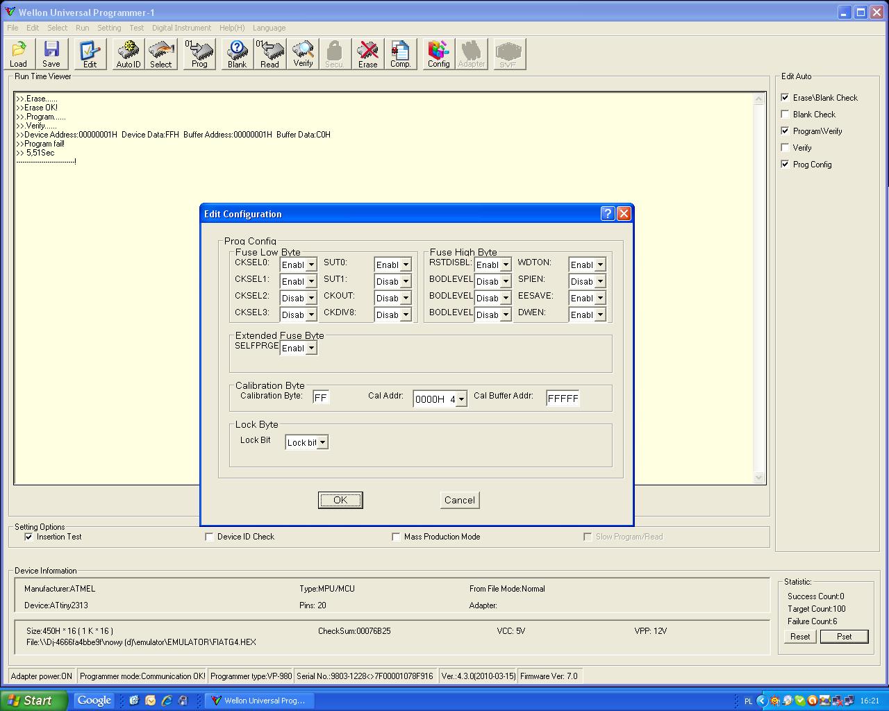 W tym problem ze nie wiem jak to jest w tym programie z pierwszego screena bo to wsadzik od attiny dostalem od znajomego a on skolei nigdy nie programowal tego sam tylko zlecał to komus innemu wedlug logiki zaznaczenie w pierwszym programie ptaszka oznacza 0 czyli enable ale nie jestem pewny