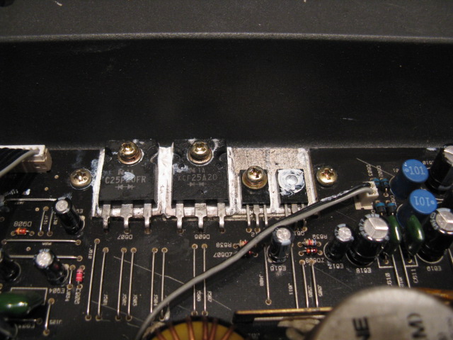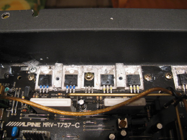 Po rozkręceniu go zobaczyłem, że zjarały mi się tranzystory w sekcji przetwornicy (o ile się nie myle) 4szt z 6 są przykopcone i popękane. Reszta (tranzystory końcowe) z tego co widze są całe, nie przypalone i nie smierdzą.