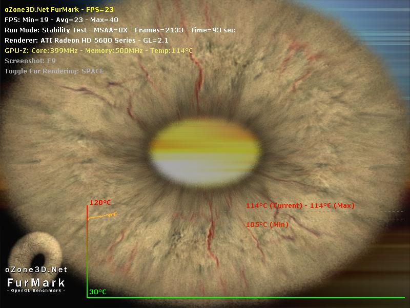 GPU-Z w idle pokazuje 80c - 85c. Odpaliłem FurMarka, po jakichś 50 klatkach reset. To znów, FurMark, karta przeszła 60 sekund, a wentyl na karcie rozpędził się do maksymalnych obrotów. Powietrze wyrzucane przez kartę jest zimne, radiator zimny, a PCB pod procesorem parzy. Potem odpaliłem GPU-Z i Furmarka, no i pierwszy raz na własne oczy widziałem coś takiego: