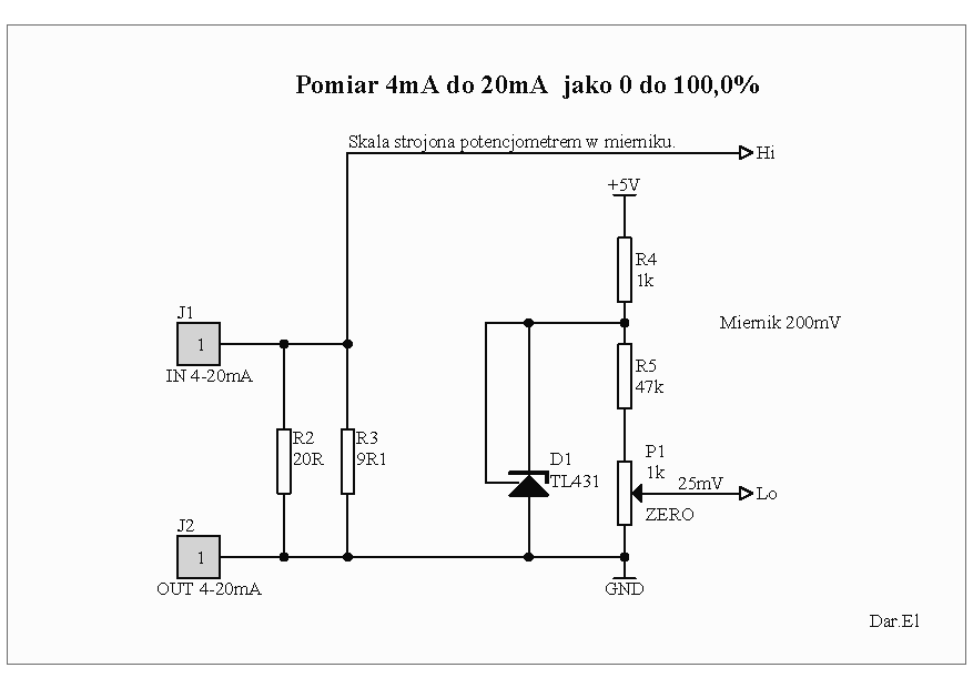 Pomiar prądu od 4mA do 20mA pokazanych procentowo. 4mA jako 00,0% do 20mA jako 100,0%.