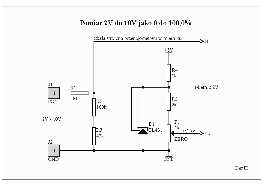 Na początek coś prostego, pomiar napięcia od 2V do 10V pokazanych procentowo. 2V jako 00,0% do 10V jako 100,0%.