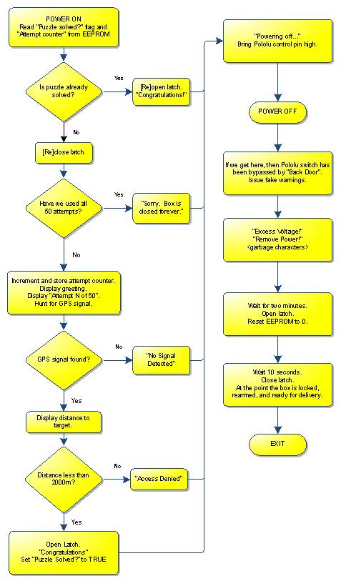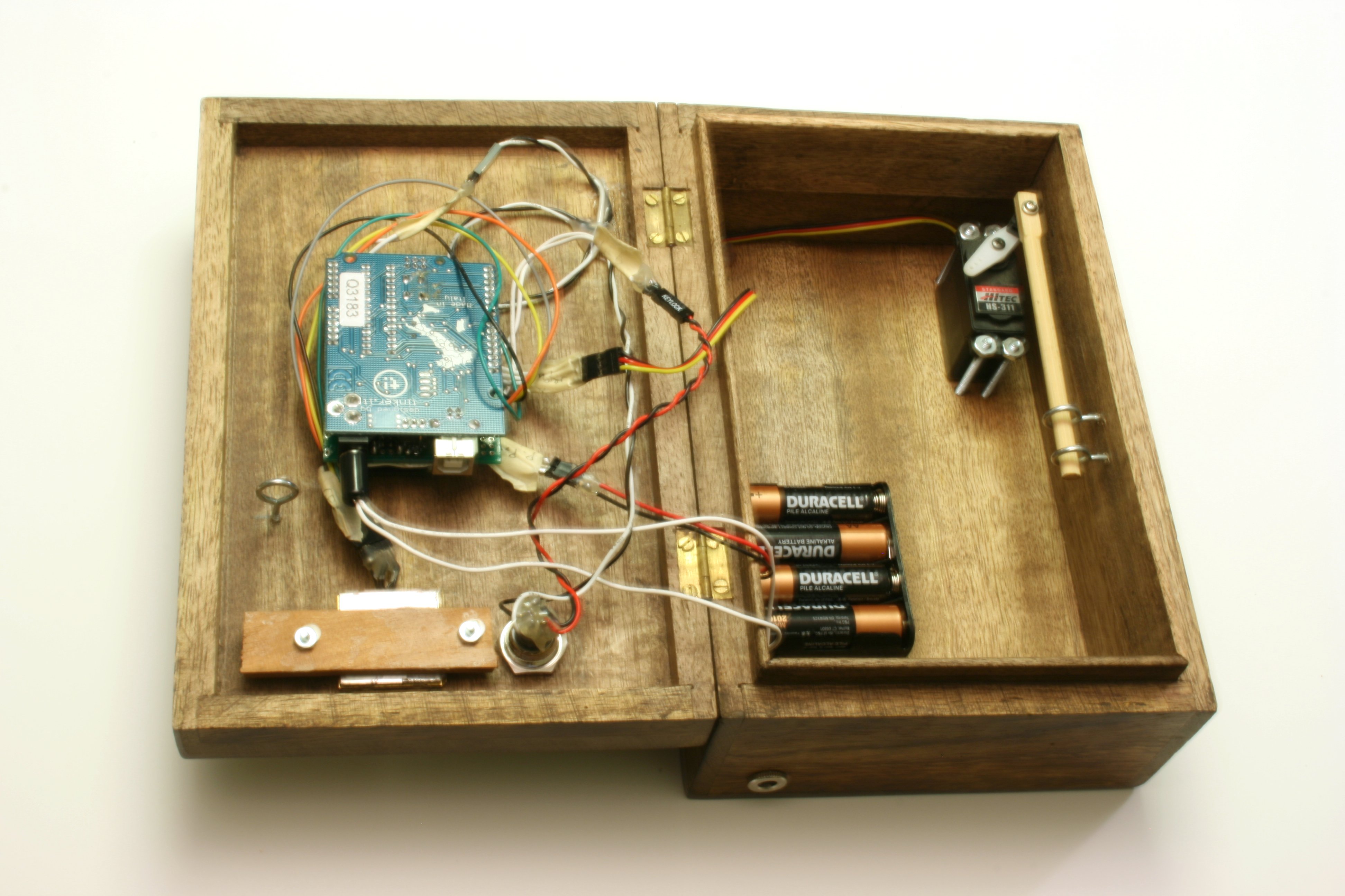 Głównymi komponentami urządzenia są: Arduino Duemilanove z mikroprocesorem ATmega168, moduł GPS EM-406A, wyświetlacz LCD 8x2 znaków, serwomechanizm Hitec HS-311 otwierający zamek oraz odpowiednie przyciski. Układ zasilany jest z czterech akumulatorów litowych AA.