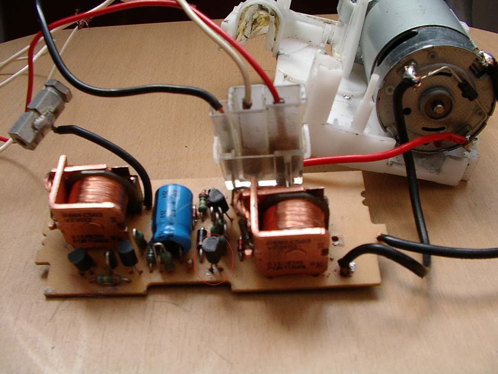 Małym kółkiem zaznaczyłem moje lutowanie pokaże ten układ od góry. Postanowiłem go przelutować ponieważ bardzo się nagrzewał wlutowałem identyczny wyglądem lecz innym oznaczeniem wiem mało fachowo tak robić. Objaw był taki że cały czas silniczek kręcił się w przeciwną stronę czyli tak jak by chciał chować ale nie stopował to wlutowałem z powrotem ten co był oryginalnie znowu silniczek wysuwa i stopuje brak chowania.
