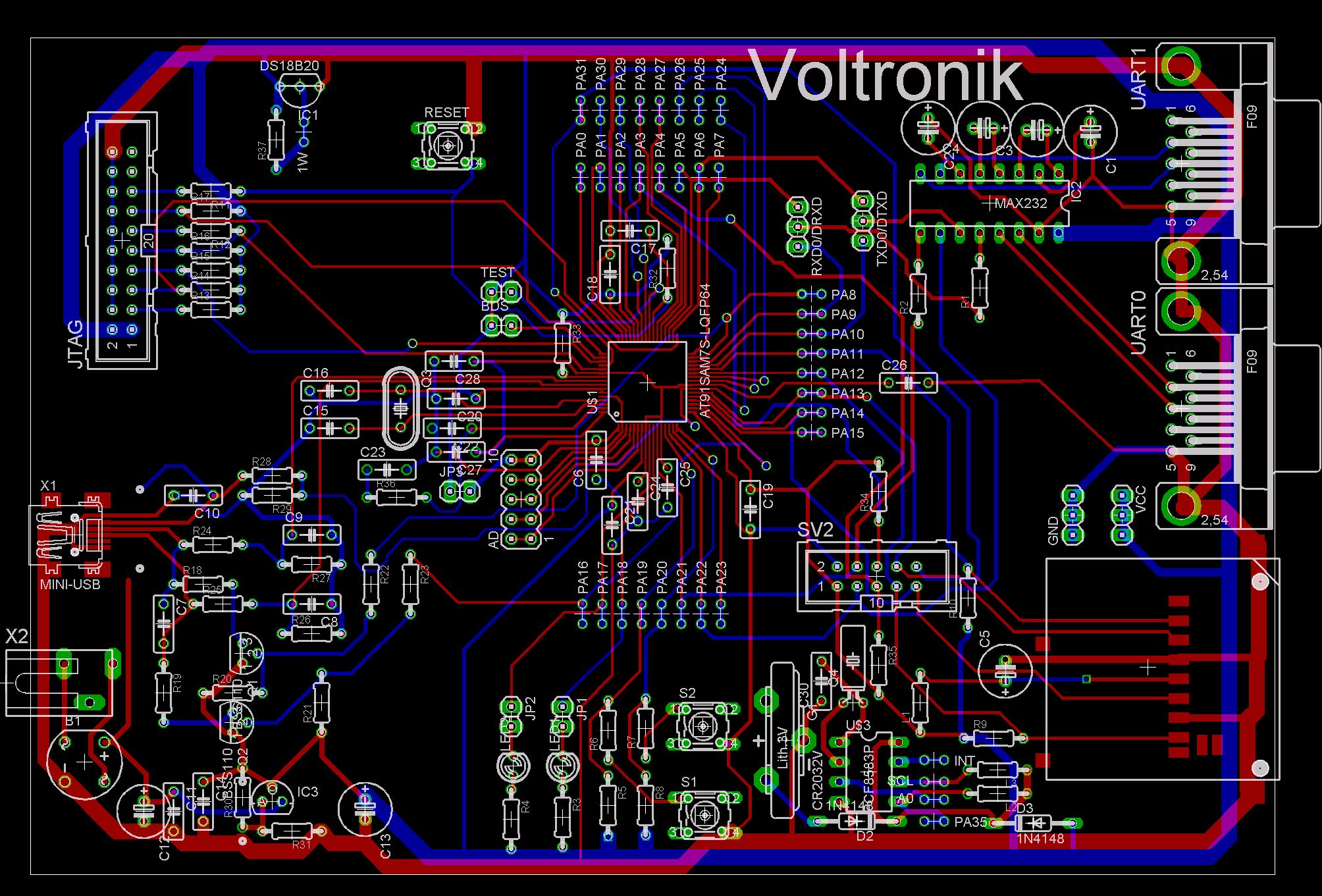 Witam prezentuje tutaj wykonany przeze mnie development board dla mikrokontrolera at91sam7s. Jako że w internecie trudno jest znaleźć gotowe schematy PCB takiej płyty musiałem wykonać ją sam. Urządzenie jest oparte na schemacie ideowym płyty uruchomieniowej firmy olimex, można się zapoznać z nią tutaj: