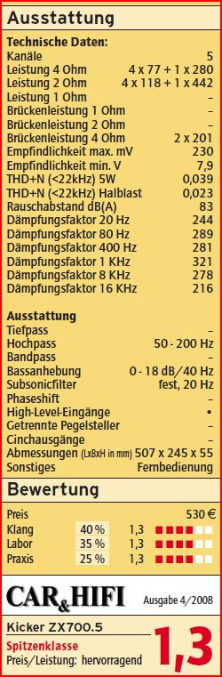 Do tej pory miałem RE Audio SE10 D4 (szedł na 2 ohmy). Wzmak to Kicker ZX700.5 oto dane z jednego z niemieckich testów:
