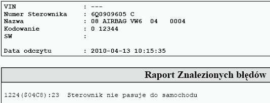 Witam.Passat B5FL zapaliła się kontrolka poduszki.Kod błędu to 1224 (s04c8) czyli sterownik nie pasuje do samochodu.Czy ktoś spotkał się z taką usterką.Klient mówi,że kontrolka zapaliła się nagle,że nic nie było grzebane,auto nie było u mechanika.Kasowanie błędu nie pomaga.Czy ktoś może mnie naprowadzić co to może być??