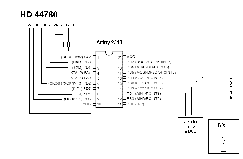Mam problem z odczytem klawiatury. Tak jak na zamieszczonym schemacie mam podłączonych 15 klawiszy do ponad połowy pinów portu PB w Attiny2313. Połączone są one za pomocą dekodera 1z15 na BCD (zrobionego z kilku 1n4148).Czyli naciskając pierwszy zwiera nam PB.0 do masy , drugi zwiera PB.1 , trzeci - PB.0 i PB.1, czwarty tylko PB.2 itd. Reasumując na PB.0 - PB.4 otrzymuję od 00001 do 11111 . Teraz jak to mam odczytać do jednej zmiennej?