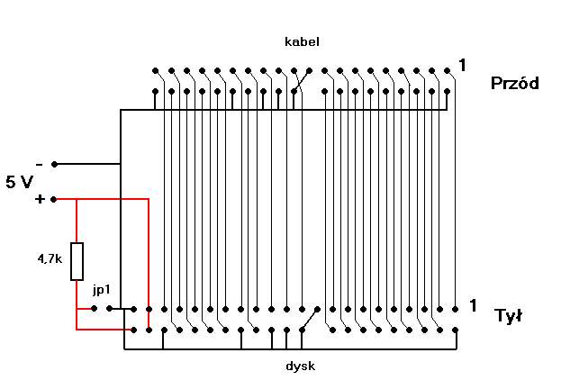 Najtrudniejsza rzeczą jest znalezienie zasilania dysku w laptopie. Patrząc na wtyk dysku laptopowego zauważymy dwa rzędy pinów, należy odszukać miejsce, gdzie brakuje jednego pina. Myślę ze jest tak we wszystkich dyskach a tam gdzie nie ma, tam najczęściej można zidentyfikować pin nr 1 a wtedy działamy z podłączeniami wg załączonego schematu. Miejsce gdzie brakuje pin dzieli złącze na dwie nierówne połowy, w części gdzie jest więcej pinów podłączamy zasilanie, analogicznie z schematem, reszta 20 pinów podłączamy do taśmy IDE w stosunku 1:1 tzn. 1 pin do 1,2 do 2 itd. nawet, jeśli coś pomylimy to nic złego się nie stanie. Ja nie chciałem przylutowywać nic do pinów dysku z laptopa, więc zastosowałem wtyczkę. Jedyna, jaka pasowała to wtyczka ze stacji dysków łącząca głowice z elektronika stacji. Pinów w niej tylko 10, więc musiałem mieć cztery takie wtyki (zbieram takie starocie wiec nie miałem z tym problemu).