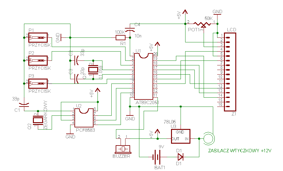 Prezentowane urządzenie, zegar z timerem kuchennym, służy do urozmaicenia wyposażenia kuchni o element pomocny przy wykonywaniu różnych czasowych czynności. Z jego pomocą już nigdy nie zapomnisz wyjąć ciasta z piekarnika, dokładnie przeprowadzić proces gotowania jajek i wiele innych. Dodatkową funkcją jest wyświetlanie aktualnego czasu i bieżącej daty w chwilach wolnych od pracy z timerem. Układ można podzielić na cztery bloki funkcjonalne: 1-blok zasilacza, 2-blok klawiatury, 3-blok procesorowy ze sterownikiem LCD i sygnalizatorem, 4-blok zegara RTC. Do budowy został wykorzystany układ PCF8583, który to w swoim wnętrzu zawiera zegar czasu rzeczywistego pracujący w trybach 12/24H, 4-letni kalendarz, licznik i kilka rejestrów dodatkowych jak np. rejestry alarmów.