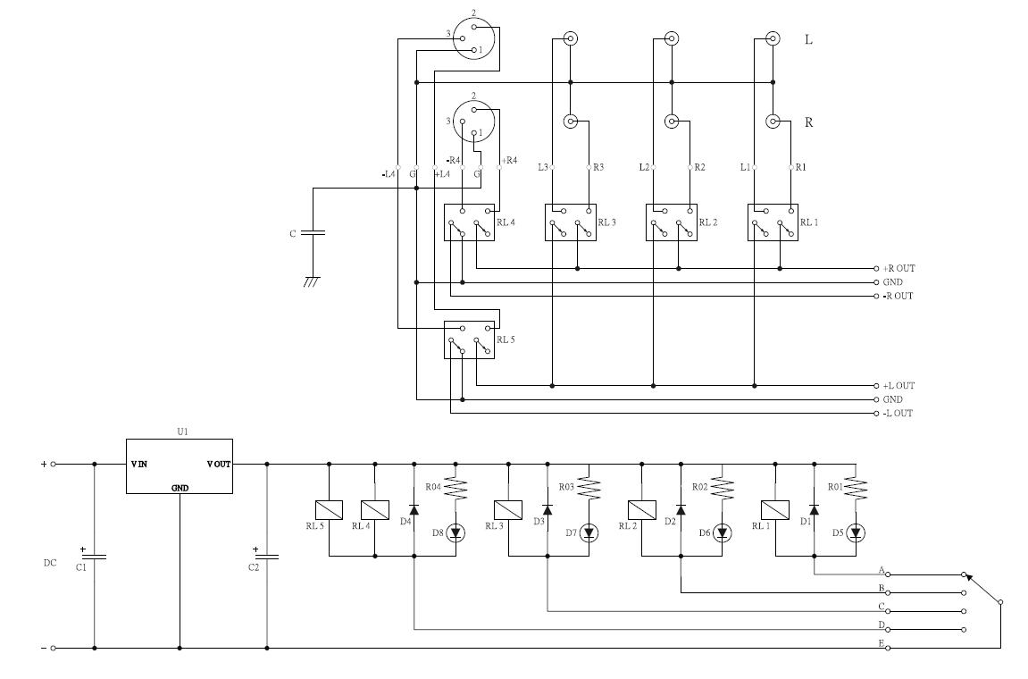 Poszukuję schematu selektora źródeł do wzmacniacza. Zależy mi na tym aby wybór źródła odbywał się poprzez guzik a nie selektor. Znalazłem w sieci schemat jak na załączonym rysunku, ale obawiam się, iż nie spełnia moich wymagań, czyli przycisk po dotknięciu i wybraniu źródła ma się od razu rozłączyć tak aby możliwe było zmienianie kanałów bez "wyłączania" przycisku.