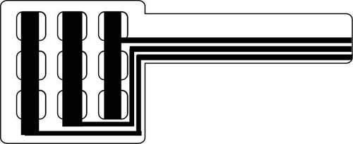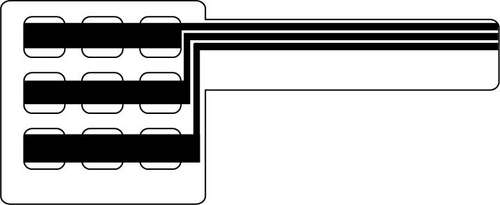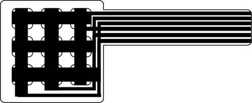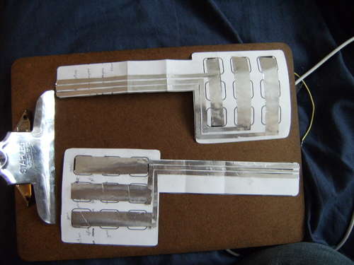 Następnie za pomocą programu graficznego nanieś linie gdzie przechodzić będą połączenia elektryczne. Każdy wiersz oraz kolumna potrzebuje oddzielnej linii. Naciśnięcie klawisza na klawiaturze spowoduje zamknięcie obiegu elektrycznego miedzy warstwą aluminium określonej kolumny i wiersza. Wzoruj się na rysunku pomocniczym. Linie zaprojektowane na komputerze posłużą jako wzór do położenia folii aluminiowej. Po wydrukowaniu wzorów z zaznaczonymi miejscami ścieżek należy przystąpić do przyklejania folii aluminiowej we wcześniej wyznaczone miejsca. Dobrym pomysłem na tym etapie jest oznaczenie ścieżek co ułatwi późniejsze podłączenie.