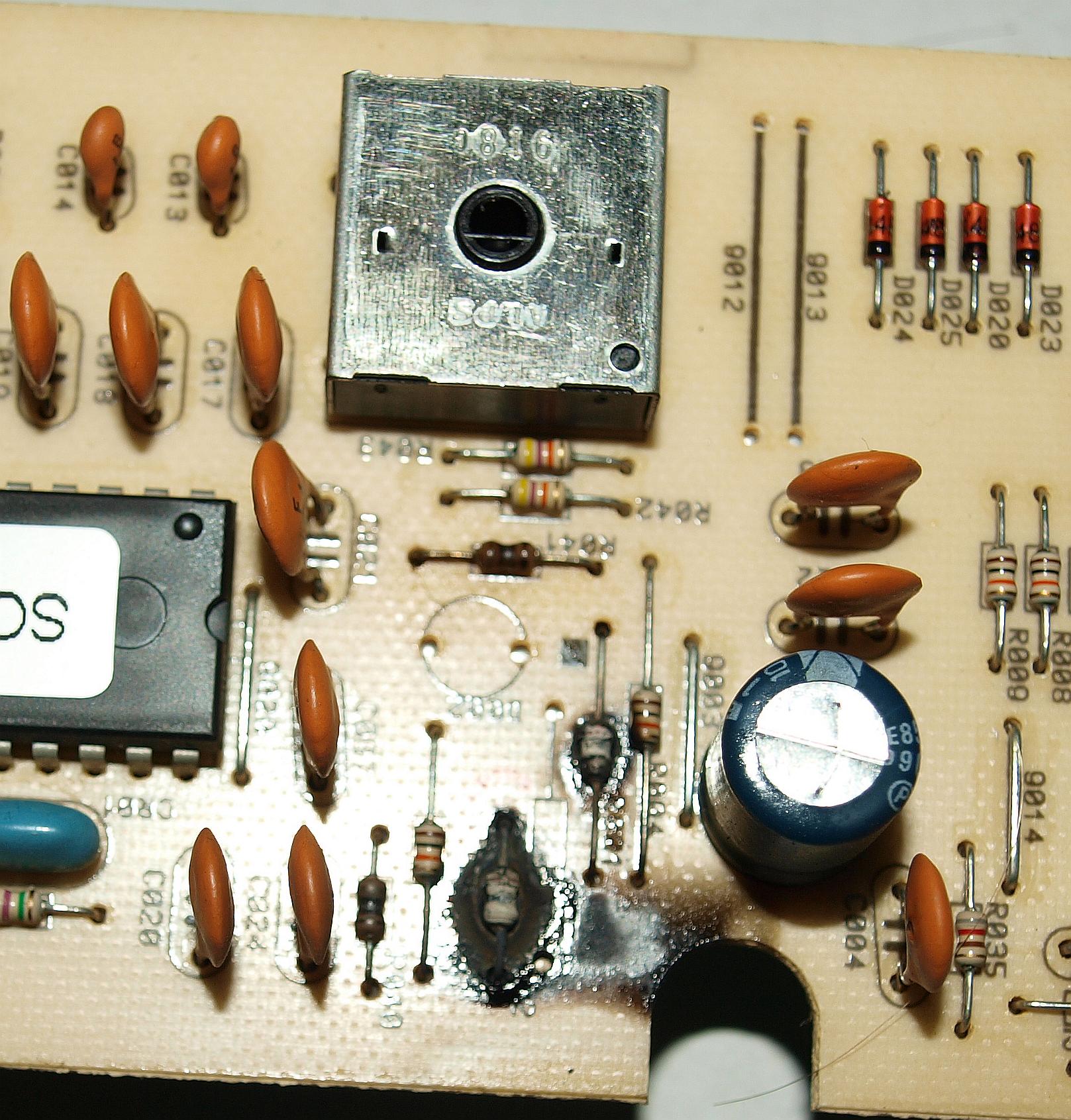 W wyniku przepięcia w sieci zadziałał warystor na module w wyniku czego wypalił ścieżki oraz co gorsza, na drugiej równoległej płytce w wyniku powstania łuku popaliło elementy. Na pierwszy widok spaliło opory: R001, R 002, R040 i R041.