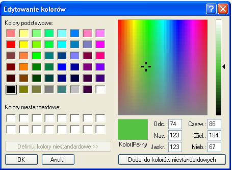 Programuje w Bascomie. Jestem początkujący. Od dłuższego czasu głowie się jak można sterując diodą led rgb (wypełnieniem 0...255) uzyskać wybrany kolor. Korzystając z palety kolorów painta (jak widać na poniższym obrazku) chcę uzyskać np. kolor zielony. Więc dla diody czerwonej (R) ustawiam wypełnienie 86/255, dla diody zielonej (G) 194/255, dla diody niebieskiej 67/255. Myślałem że te czynności wystarczą żeby osiągnąć zamierzony efekt, ale przeoczyłem fakt że należy jeszcze dobrać dla każdego koloru diody odpowiedni rezystor. I tu pojawia się moje pytanie. Czy jest jakaś zależność dzięki której można tak dobrać rezystory, że będę mógł na podstawie palety kolorów painta uzyskać dokładnie taki kolor jaki sobie wybiorę? Szukając odpowiedzi na różnych forach znajdowałem tylko rozwiązania typu "dobór rezystorów metodą prób i błędów", ale jest to dla mnie trochę droga przez mękę.