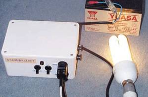 Urządzenie pozwala na awaryjne zasilanie wszelkiego typu żarówek energooszczędnych do 24W z dowolnego akumulatora 12V. Akumulator 60Ah umożliwia zasilanie żarówki 24W (odpowiednik żarówki z włóknem 100W) przez okres jednej doby, natomiast akumulator 12Ah zasila 11W energooszczędną żarówkę przez około 8h. Układ to popularna przetwornica z 12V na 230V z nastawianiem na żarówki energooszczędne. W roli generatora astabilnego wcielono Ne555. VR2 pozwala na regulację częstotliwości generowanego sygnału. Wygenerowany sygnał trafia do MOSFETów. Kondensator C4 pozwala na zgromadzenie chwilowej energii potrzebnej do załączenia żarówki energooszczędnej. Dlatego najlepiej jest włączyć sam układ a dopiero później żarówkę.