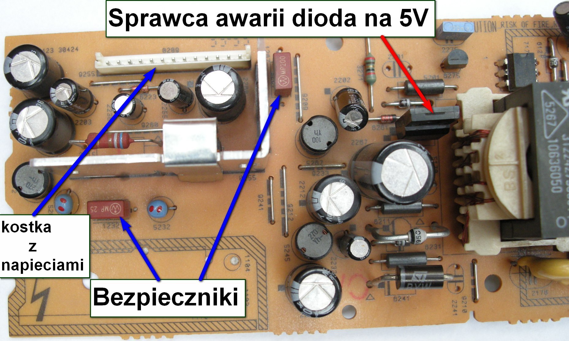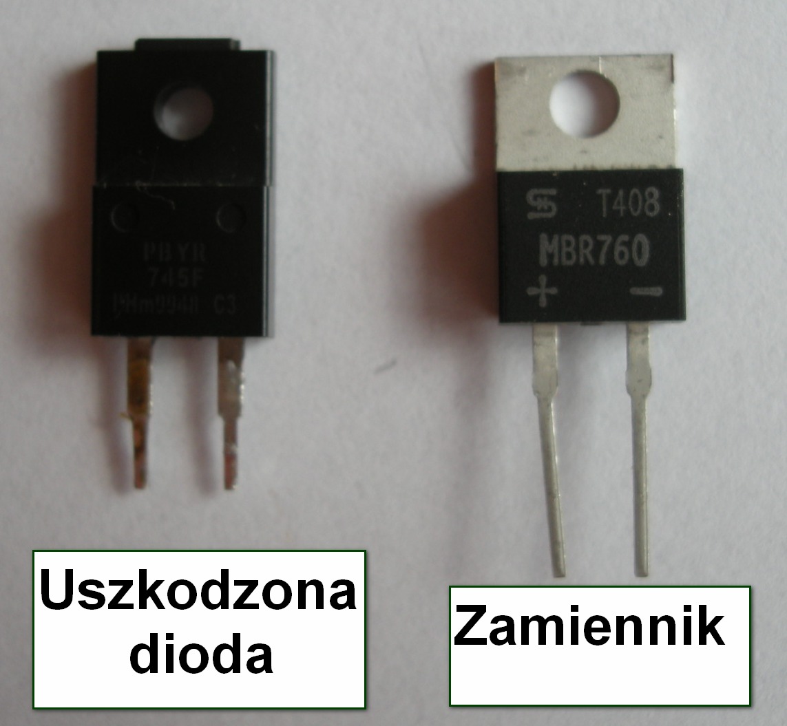 Bezpieczniki po stronie wtórnej dobre, a sprawcą zamieszania okazuje dioda PBYR 745F na max. napięcie 45V.