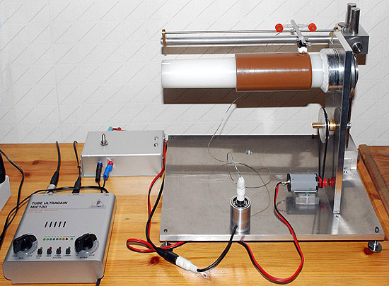 Prezentowane urządzenie to fonograf wykonany w XXI wieku. Podstawa to 24 x 32 x 1 cm płyta aluminiowa. Jest łatwa w kalibracji przy użyciu śrub regulacyjnych na rogach. Wykorzystany napęd to elektryczny silnik prądu stałego marki Swiss. Dzięki użyciu koła pasowego nagrania odtwarzać można różnymi prędkościami. Przełożeniem napędu obciążony jest pasek napędowy.