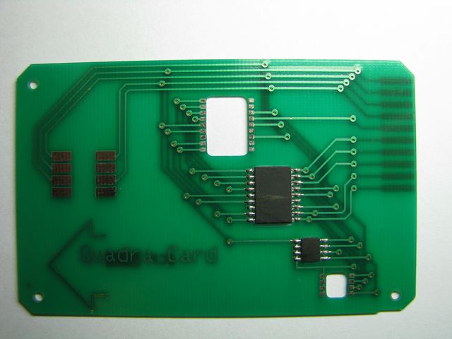 Wynikiem tych namysłów jest elektroniczna wizytówka o rozmiarach karty kredytowej (85.6 x 54 mm) z dwoma odrywanymi rogami. Strona czołowa posiada wszelkie dane kontaktowe autora, na drugiej stronie przylutowane są wszystkie części elektroniczne. Mikroprocesor został sprytnie zamontowany w okienku w płytce tak aby jego wysokość rozkładała się na dwie strony płytki. Ma to na celu zmniejszenie grubości płytki. Po oderwaniu rogów płytki można ją podłączyć do portu USB komputera.