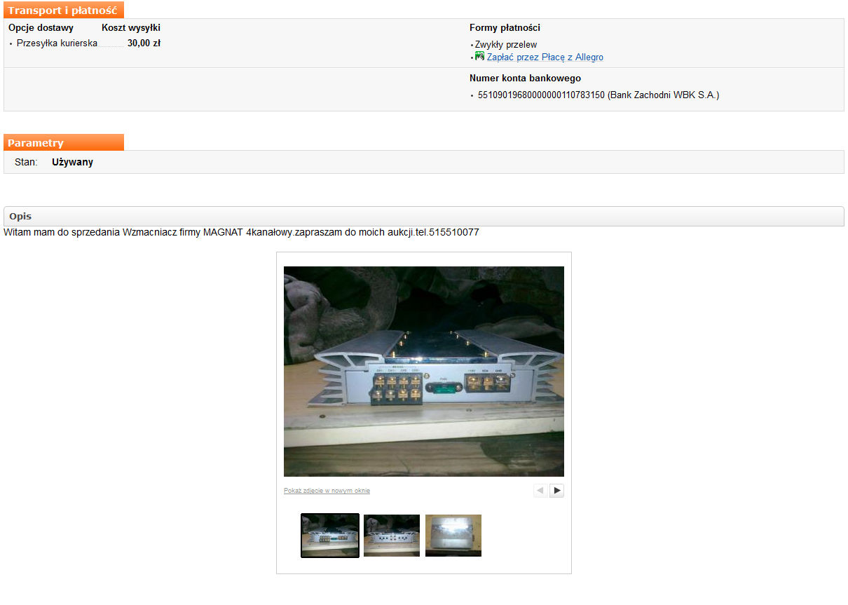 Cytat:5.5. Opis Towaru powinien być rzetelny i kompletny oraz nie może wprowadzać w błąd innych Użytkowników, w szczególności co do właściwości Towaru, takich jak: jego jakość, pochodzenie, marka czy producent. Opis Towaru powinien być zgodny z wymogami prawa, w szczególności powinien zawierać wymagane w określonych okolicznościach informacje, w tym informacje wskazane w obowiązujących przepisach dotyczących ochrony konsumentów. Użytkownik ponosi pełną odpowiedzialność za treści umieszczone przez siebie w opisie Aukcji, w tym jest odpowiedzialny za wszelkie błędy lub nieścisłości takiego opisu.