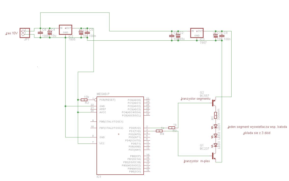 -----Witam chciałbym zrobić sobie zegarek na dużych wyświetlaczach 7-mio segmentowych ale mam z nimi problem taki że jeden segment to trzy diody połączone szeregowo i do ich zaświecenia potrzebuje ok 7V i dużo większego prądu niż port atmegi może wydolić, myślałem nad czymś takim ale wole wcześniej zapytać niż trawić po 10 razy płytkę. Na zdjęciu jest uproszczony schemat-----