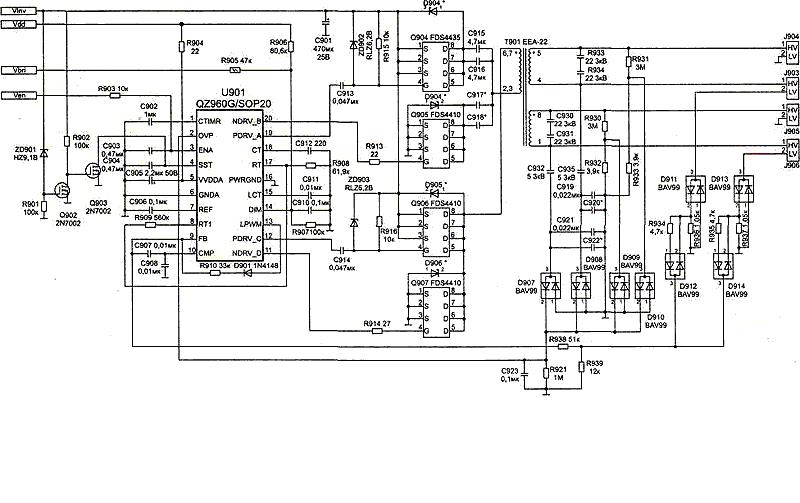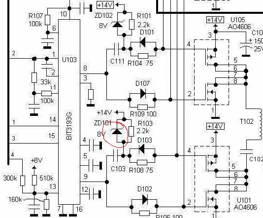 Na module inwertera i zasilacza, rozerwany U101 / 4606 i mocno przegrzane okolice trafka T102. Dodatkowo spuchnięte C101 i C105 / 150mF25V.
