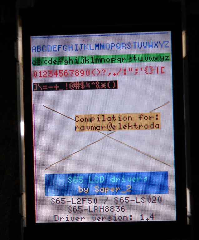 Na początek standardowo ściągnąłem sterowniki ze strony Kranza do L2F50, próbowałem z innymi sterownikami,kwarc 16 MHz, podłączenie takie jak na schemacie kranza (dzielnik napięcia), podświetlenie led z zasilacza laboratoryjnego, obie masy połączone, Atmege programuje przez ISP brak JTAGa, zauważyłem, że linie kolorowe wyświetlają się tylko jeżeli jest podłączone DAT natomiast reszta jest obojętna czy jest czy nie ma i tak wyświetla linijki.