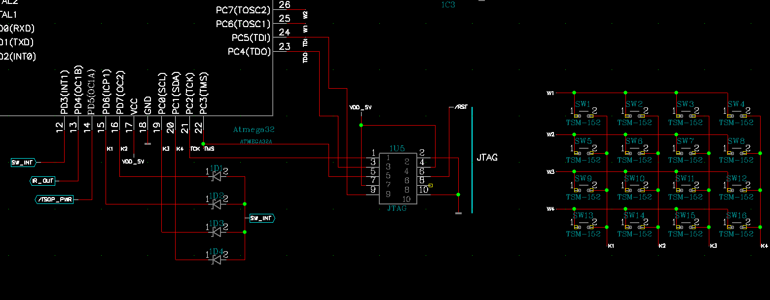 Problem jest taki, że nie działa to na jednej linii, a konkretnie W4. Jest na niej stan niski i w momencie naciśnięcia SW13, SW14, SW15 lub SW16 na linii SW_INT nie pojawia się "0", tylko utrzymuje się jedynka z wewnetrznego podciagniecia. Sprawdzalem ze na nozkach przycisku sa te stany co trzeba (na jednej 1, na drugiej 0) i przycisk poprawnie zwiera, jednak jest tak jakby jedynka byla "mocniejsza" niz "0" z linii W4.