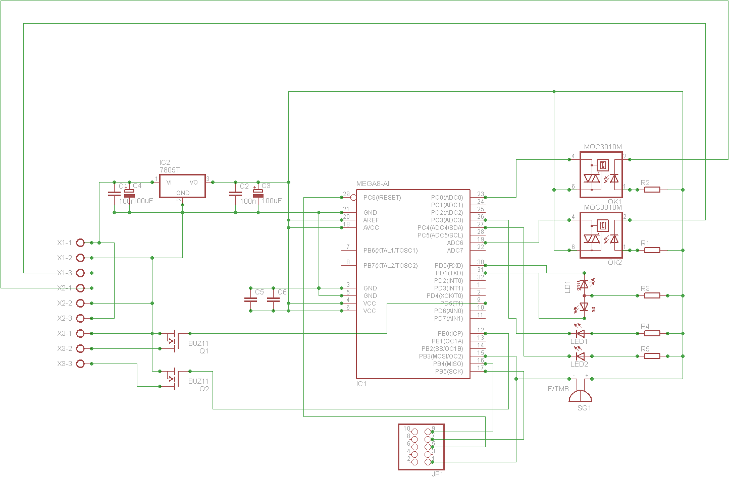 Czujniki ruchu chciałem odizolować optycznie od reszty układu poprzez optotriaki. Niestety jest to jeden z moich pierwszych projektów więc nie do końca przemyślałem wszystkiego i jeden z optotriaków podłączyłem pod dedykowaną nóżkę procesora ADC6 (mowa tu o atmega8 w obudowie TQFP gdzie jest jedna noga dodatkowa tylko do ADC - 19 nóżka).
