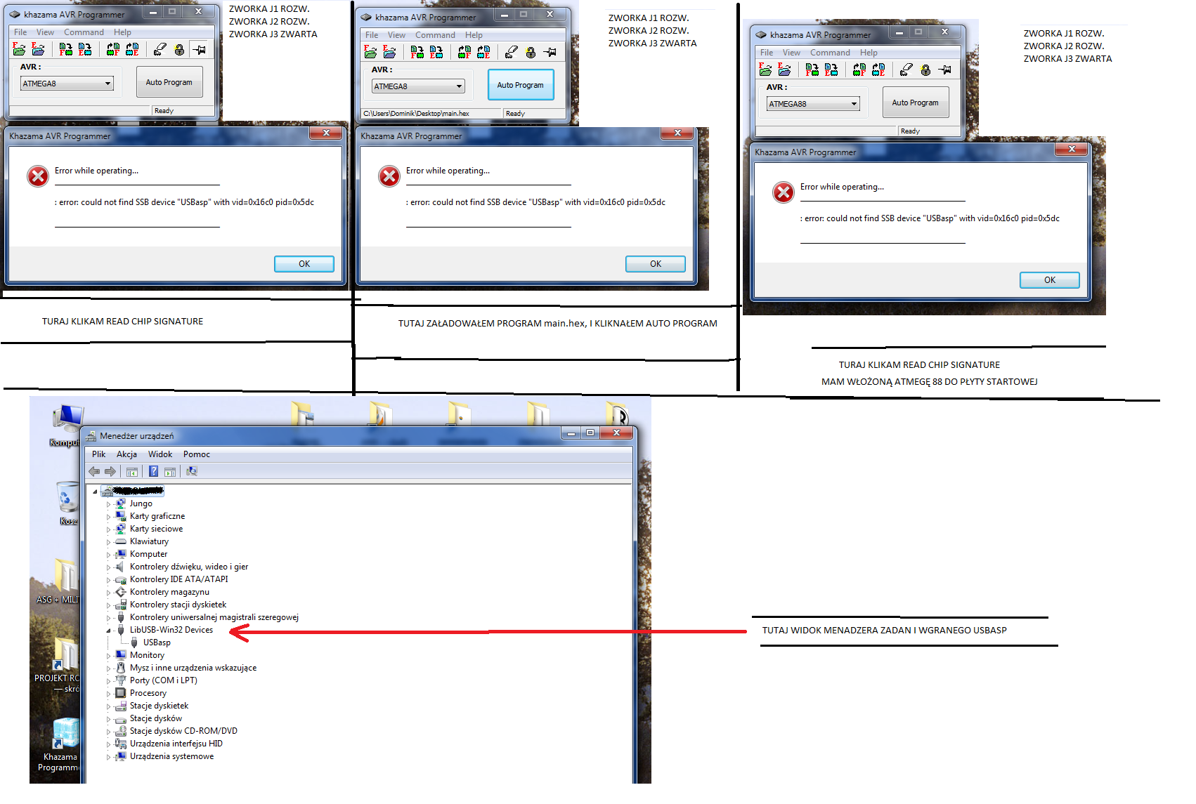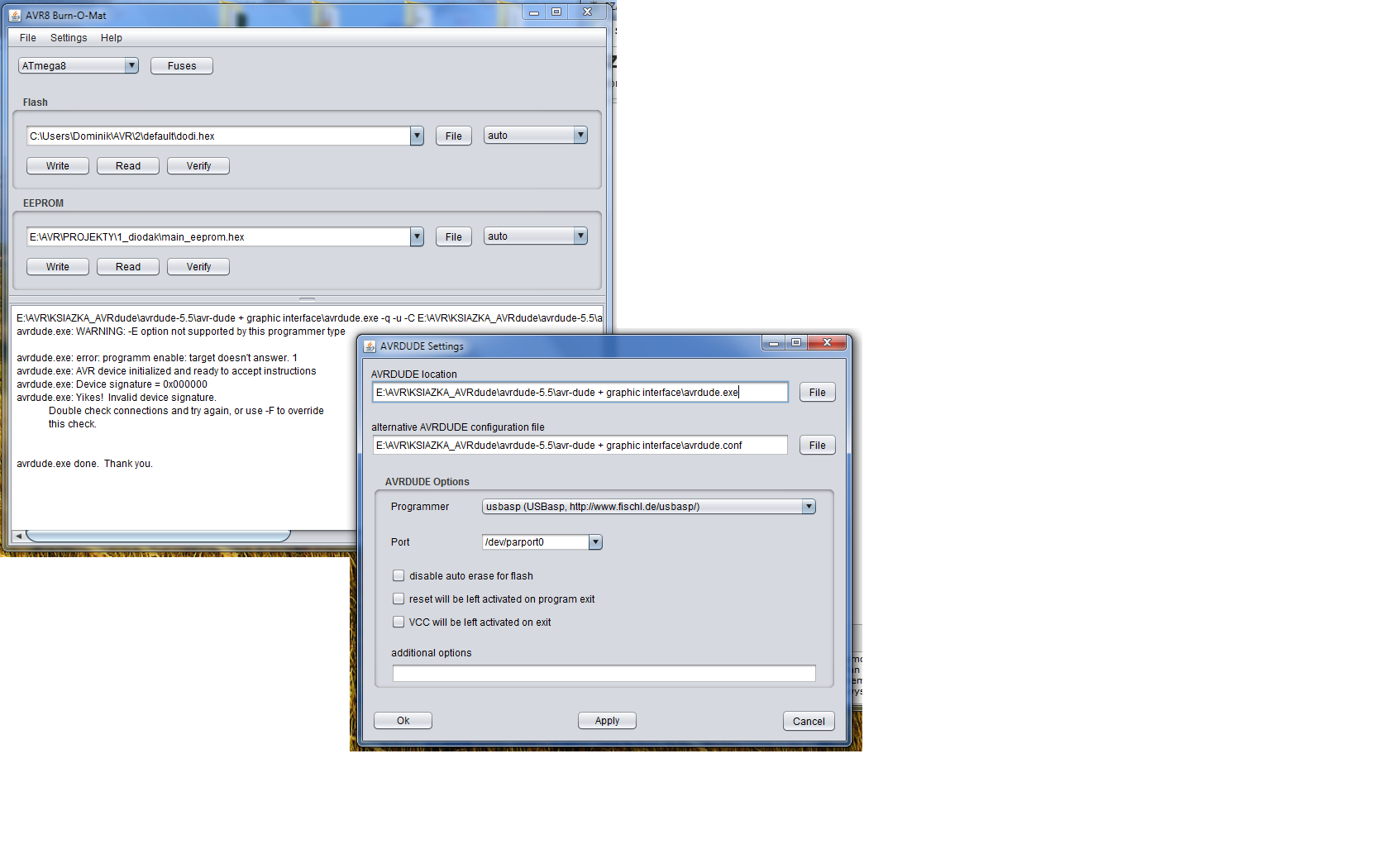 Jeśli chodzi o programowanie - to NIESTETY w programie AVRdude (z nakładką burn-o-mat) wyskakuje mi błąd. Device signature = 0x000000
