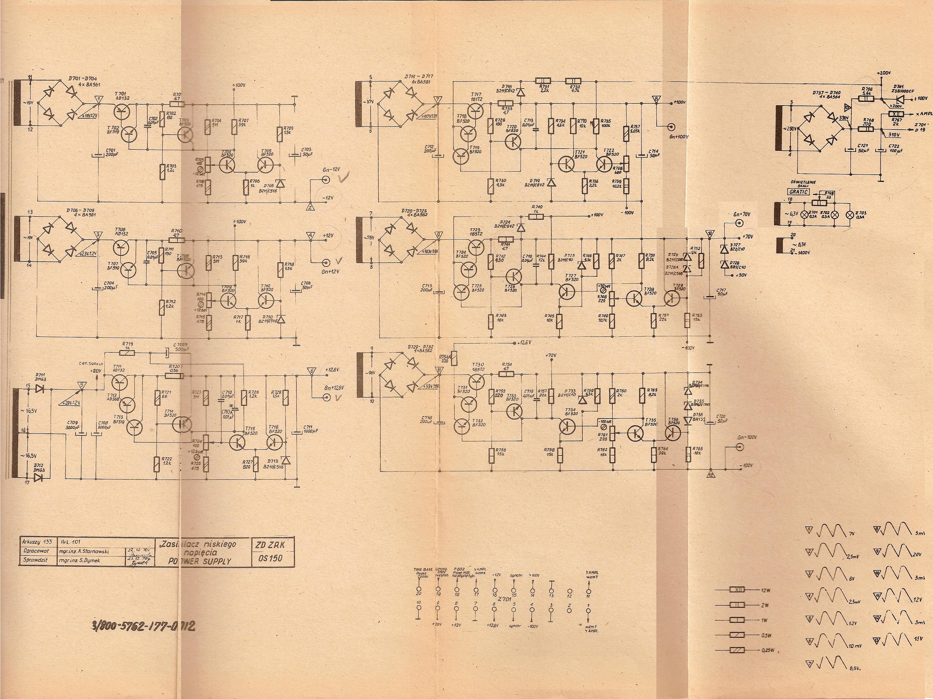 Problem dotyczy oscyloskopu OS-150, na początku wszystko było ok, niestety po paru dniach użytkowania na ekranie lampy pojawił się niemrawy zygzak, po sprawdzeniu napięć kontrolnych okazało się że zamiast +100V było +78 a zamiast +70V było +58V Natomiast napięcia: +12V, -12V, +12,6V, -100V były poprawne. po zmierzeniu napięć za mostkami prostowniczymi okazało się że napięcia na węzłach 7 i 9 (na schemacie w trójkącikach) są znacznie obniżone i zdaje się w tym miejscu popełniłem błąd przy diagnozie bo postanowiłem wymienić diody w mostkach nie zauważając ze napięcia te nie zależą tylko od mostków ale są powiązane z większą częścią zasilacza, następnym błędem było uruchomienie oscyloskopu z wymienionym mostkiem przed węzłem 7 bez diód przed 9 i dopiero się zaczęło, mianowicie spalił się rezystor R766 i pali się do tej pary nawet przy całkowicie zmontowanym układzie. Prąd jaki przez niego przepływa to 0,04A ponad dwukrotnie za duży co wydziela dużo ciepła. sprawdziłem wszystkie tranzystory. Dwa PF520 wymieniłem, reszta ok lecz rezystor nadal się pali. Odczepiłem kondensator C714 i też nic nie dało. Teraz zamiast +100V jest 92V i zamiast +70 jest +61V. Natomiast -100V , 12V, 12,6V i -12V są prawidłowe, na odczepach z trafa napięcia też są ok. Proszę o pomoc w diagnozie. Pozdrawiam