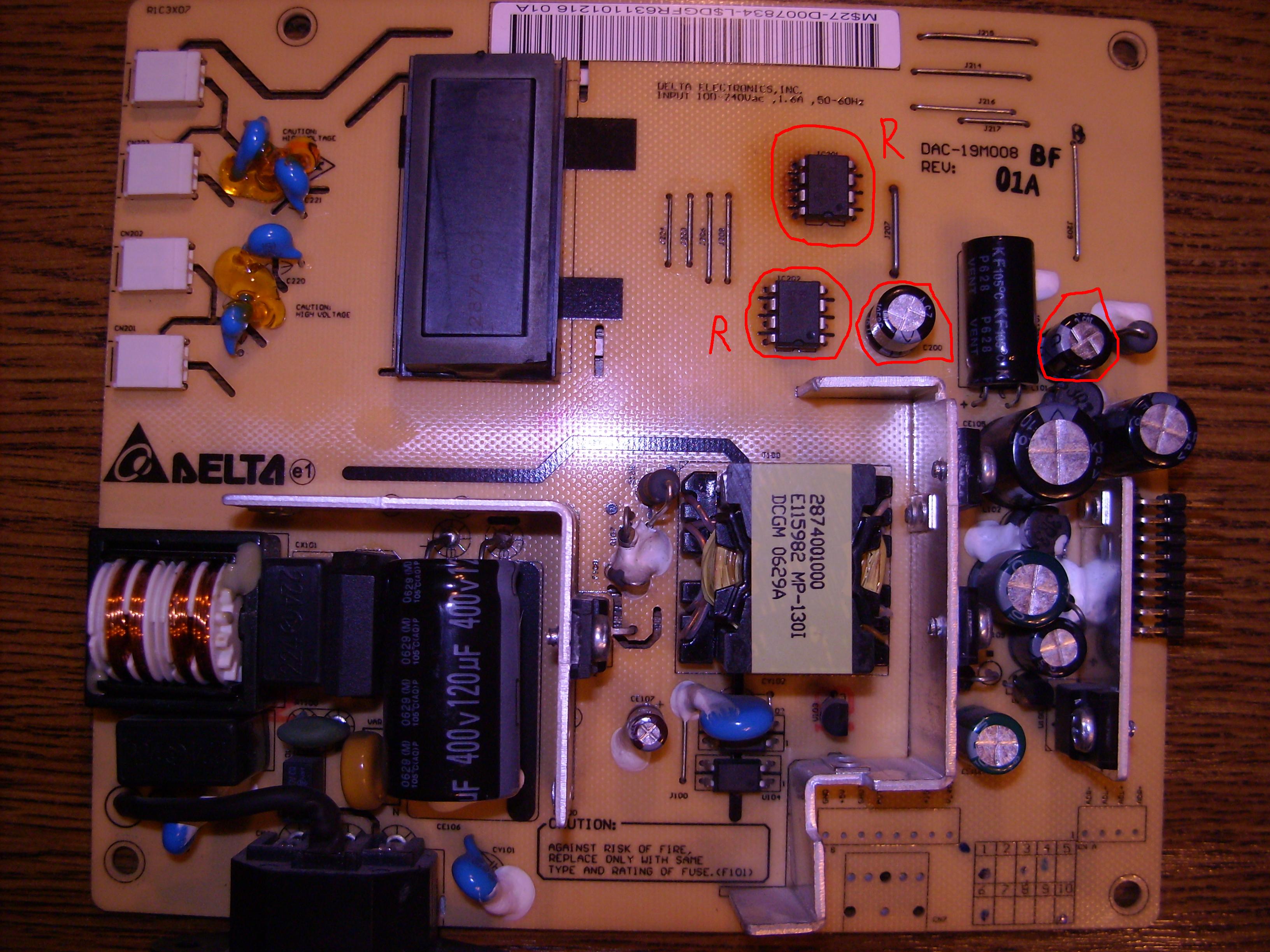 Może ktoś z Szanownych Kolegów miał do czynienia z tą odmianą zasilacza i wie na jakie scalaki można podmienić BZ6L2R i L, ponieważ sądzę że to one są przyczyną usterki. Poniżej zamieszczam zdjęcie z zaznaczonymi scalakami i wymienionymi kondensatorami, oraz zdjęcie płytki od drugiej strony. Bezpiecznik SMD został założony dwu amperowy.