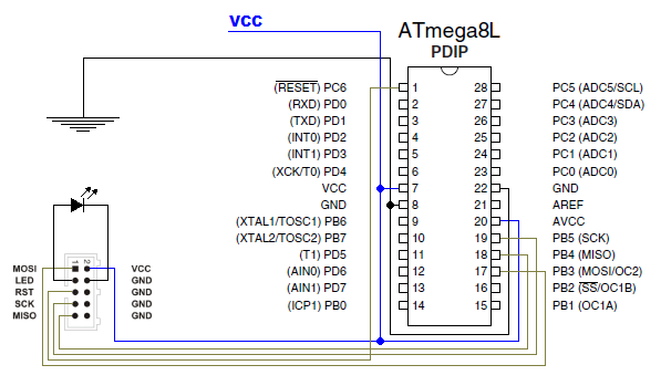 Przy probie odczytu czegokolwiek z użyciem programatora dostaje błąd: "programm enable: target doesn't answer. 1 [...] initialization failed, rc=-1". Sprawdziłem układ zasilania i jest w porządku, zatem podejrzenie pada na złącze programatora... Schemat tego, jak to jest podłączone u mnie załączam poniżej. Nie wiem co by mogło być nie tak ale sprawa jest dziwna - na jakąś setke razy wysyłania poleceń do avr'a RAZ wszystko zadziałało - program odczytał sygnaturę, z tym że była ona niezgodna (Atmega8 ma końcówkę 93 00, z mojej Atmegi8L odczytał 93 07 i klapa