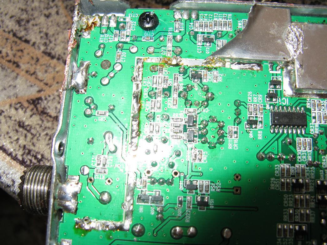 Początkowo w radiu pojawił się problem z odbiorem sygnału zamiast rozmowy wyło słuchać cichy pisk. Naprawiłem usterkę zgodnie z znalezionym prze zemnie rozwiązaniem. Teraz gdy podłączam radio do zapalniczki dymi się z jednego rezystora po za tym radio wydaje się być sprawne oznaczyłem go na rysunku proszę o pomoc.