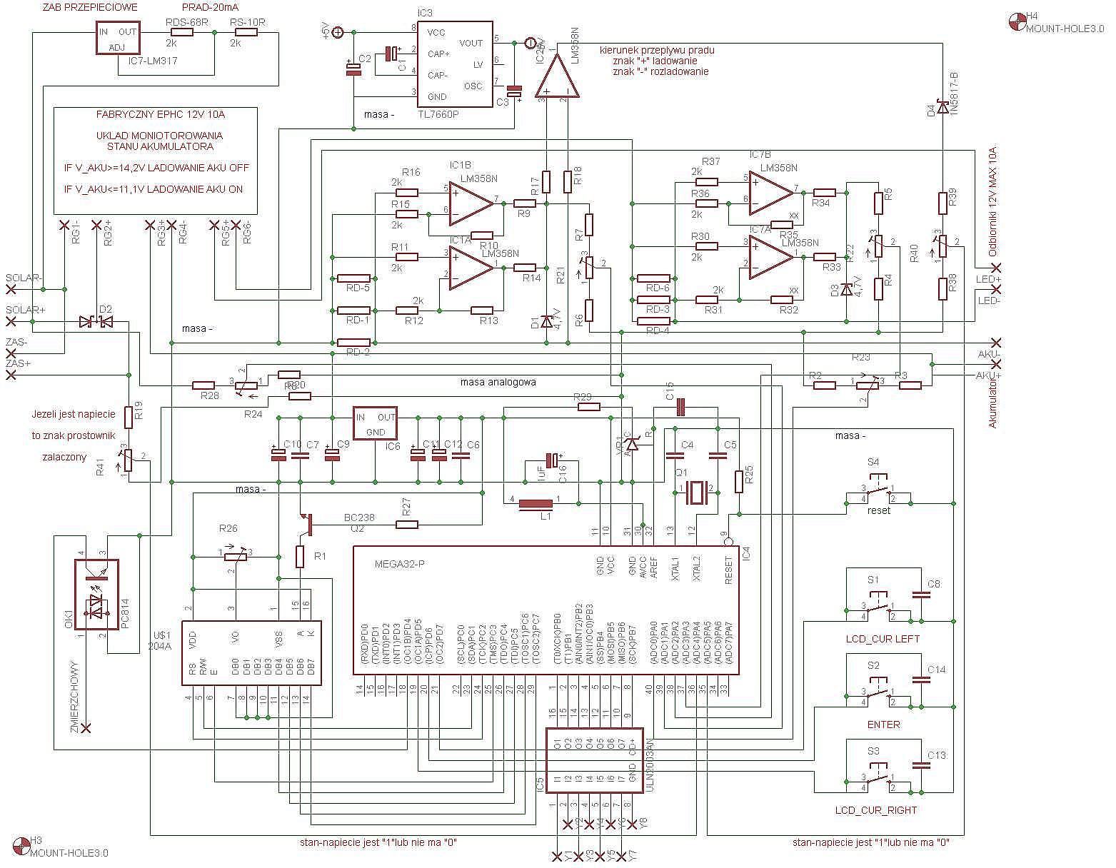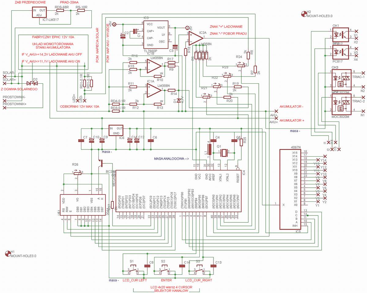 ..jest to projekt monitorowania ogniwa foto-galwanicznego z zasilaniem rezerwowym (przetwornica ~230/17V). Ładowanie akumulatora w trybie automatycznym a gdy za mało słońca [ustawione napięcia progowe akumulatora] załączającym rezerwowy prostownik[przetwornica 230V/17V]. Całość zasila obwody niskonapięciowe oświetlenia LED oraz żarówek energooszczędnych na 12V[FOCOS]. Manualne sterowanie 10 obwodami sieciowymi [220V][tablica z niezależnymi obwodami gniazd 230V] poprzez optotriaki.